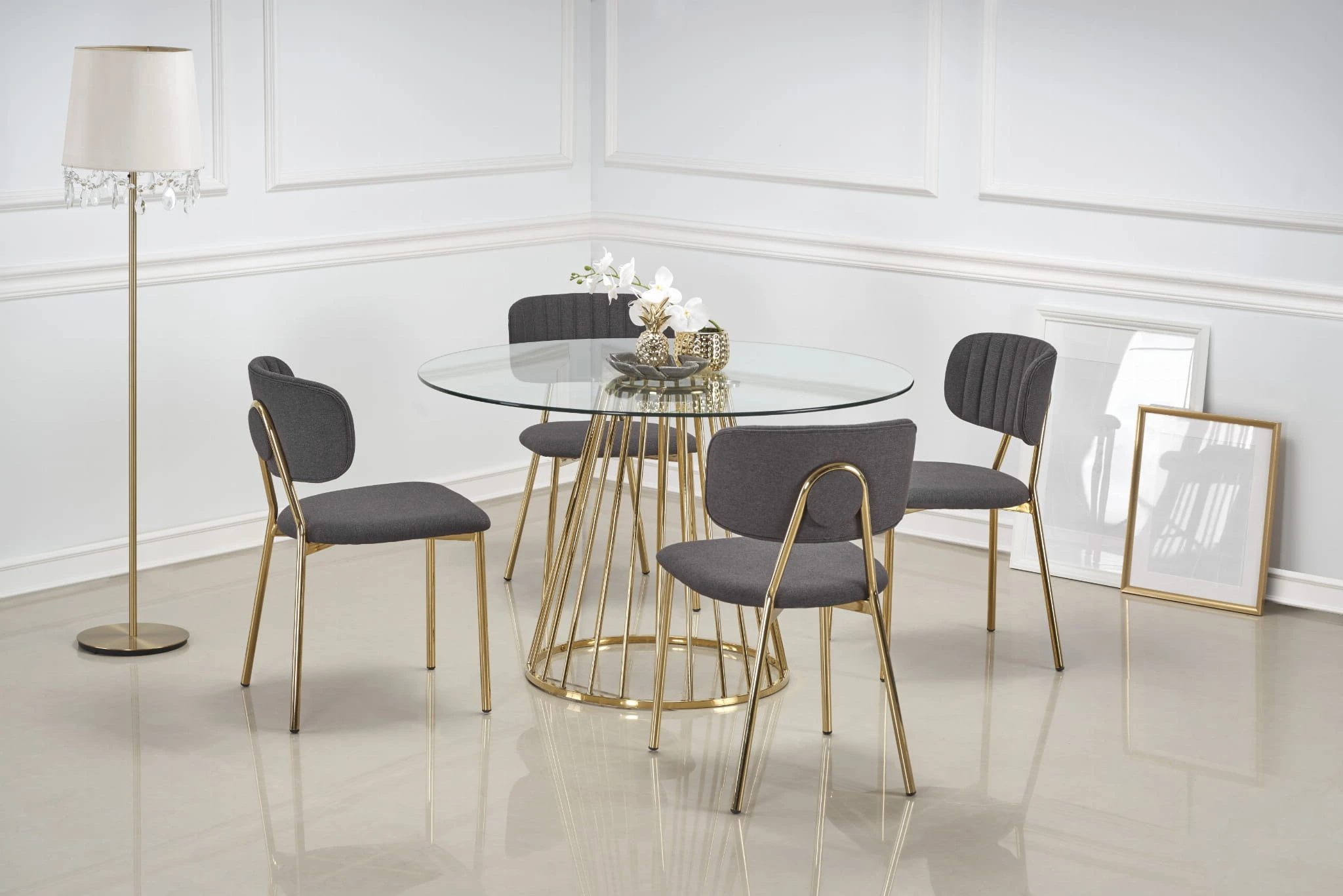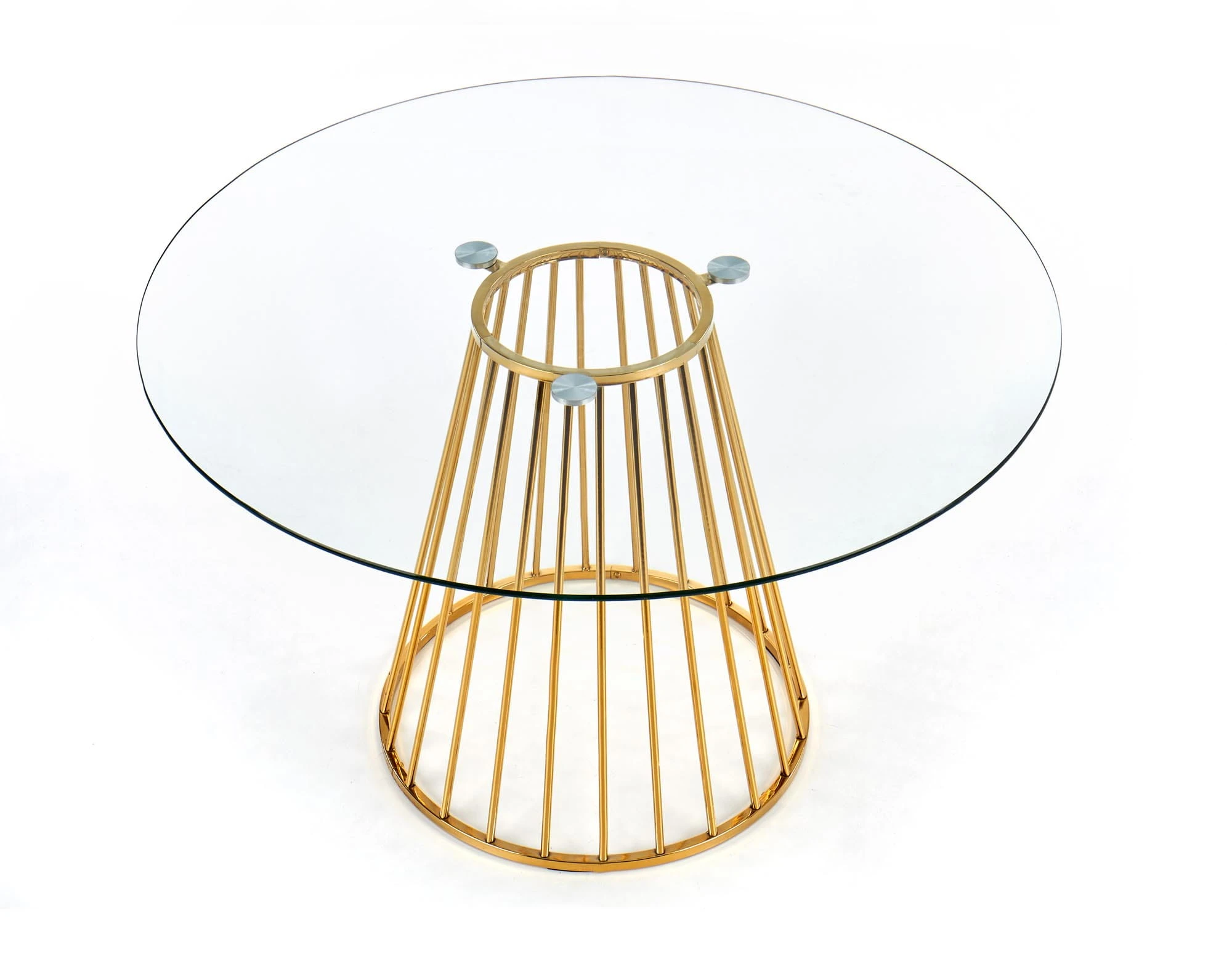 wymiary: o120/75 cm, materiał: szkło / stal chromowana, kolor: blat - transparentny, nogi - złoty