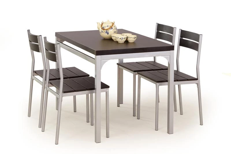 Blat stołu wykonany jest z płyty meblowej komórkowej, okleinowanej. Kolor wenge lub dąb sonoma. Siedziska oraz oparcia krzeseł wykonane sa z płyty MDF - okleinowanej. Stalowe profile malowane są metodą proszkową na kolor srebrny.