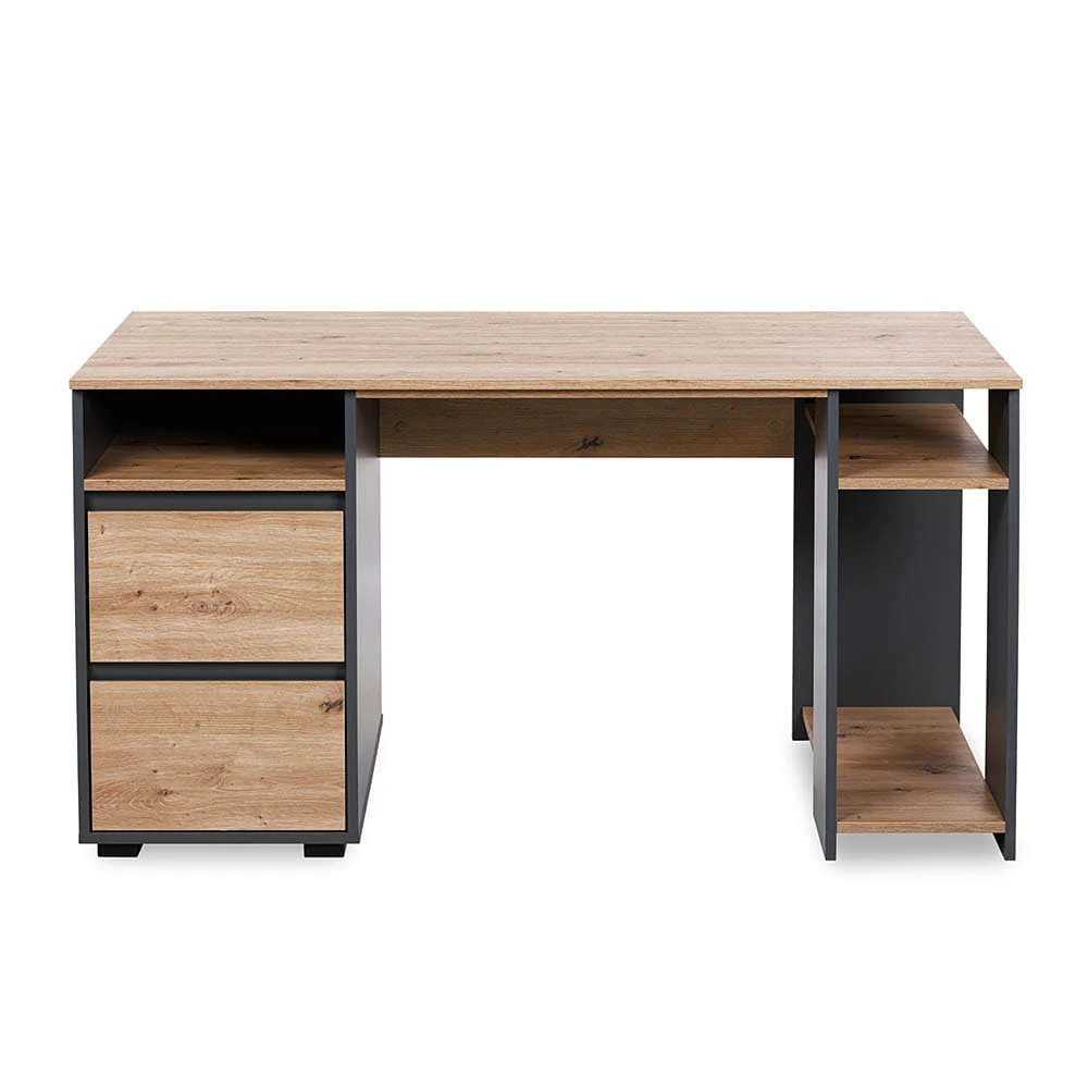 Biurko Dalia antracyt -dąb to funkcjonalny i nowoczesny mebel idealny do pokoju młodzieżowego lub domowego biura. Utrzymane jest w kolorystyce drewna dębowego oraz antracytu, co nadaje mu lekkości i uniwersalnego charakteru. Posiada dwie praktyczne szuflady, które ułatwiają przechowywanie przyborów szkolnych, dokumentów czy drobiazgów. Nad szufladami znajduje się otwarta półka, która sprawdzi się jako miejsce na książki lub notatki.