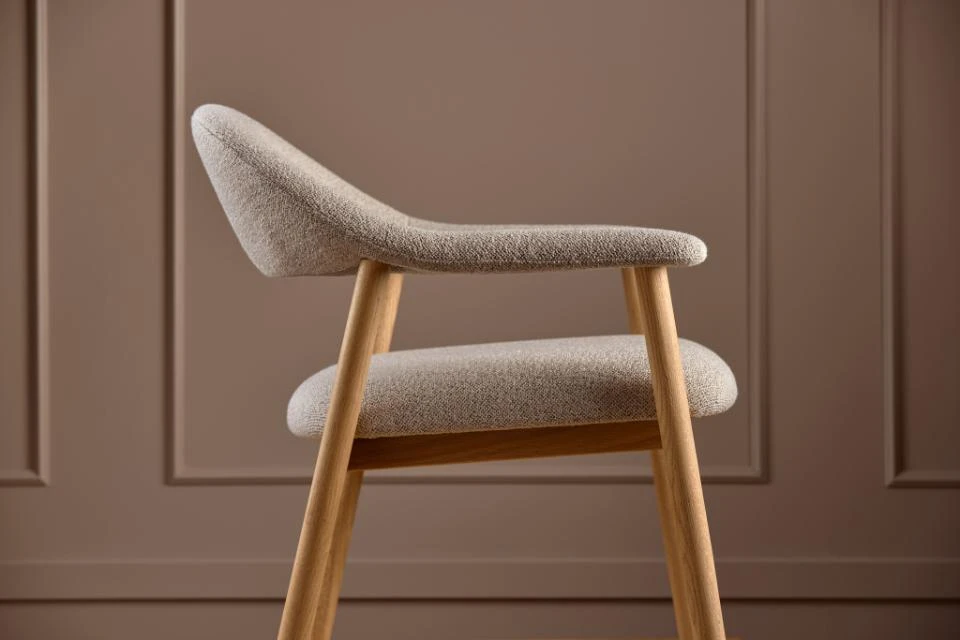 Stelaż fotela ADDI wykonany jest z olejowanego drewna dębowego, co nadaje mu naturalny i ciepły wygląd. Siedzisko i oparcie pokryte są beżową tkaniną Monza 60 o strukturze przypominającej boucle, która jest miękka i przyjemna w dotyku. Tkanina ta charakteryzuje się wysoką odpornością na przetarcia i blaknięcie, co zapewnia trwałość mebla przez długie lata.