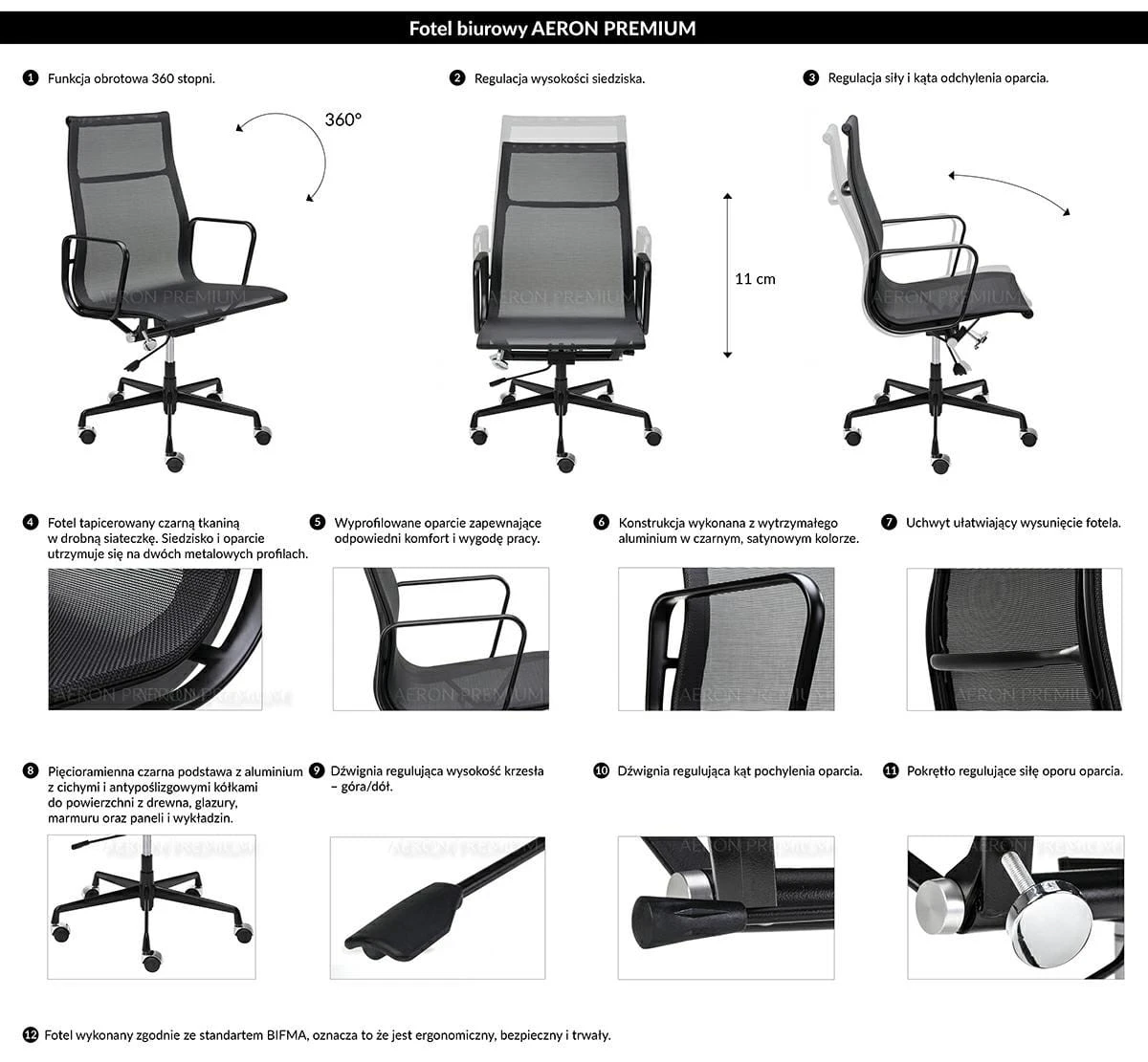 Fotel biurowy AERON PREMIUM czarny siatka aluminium