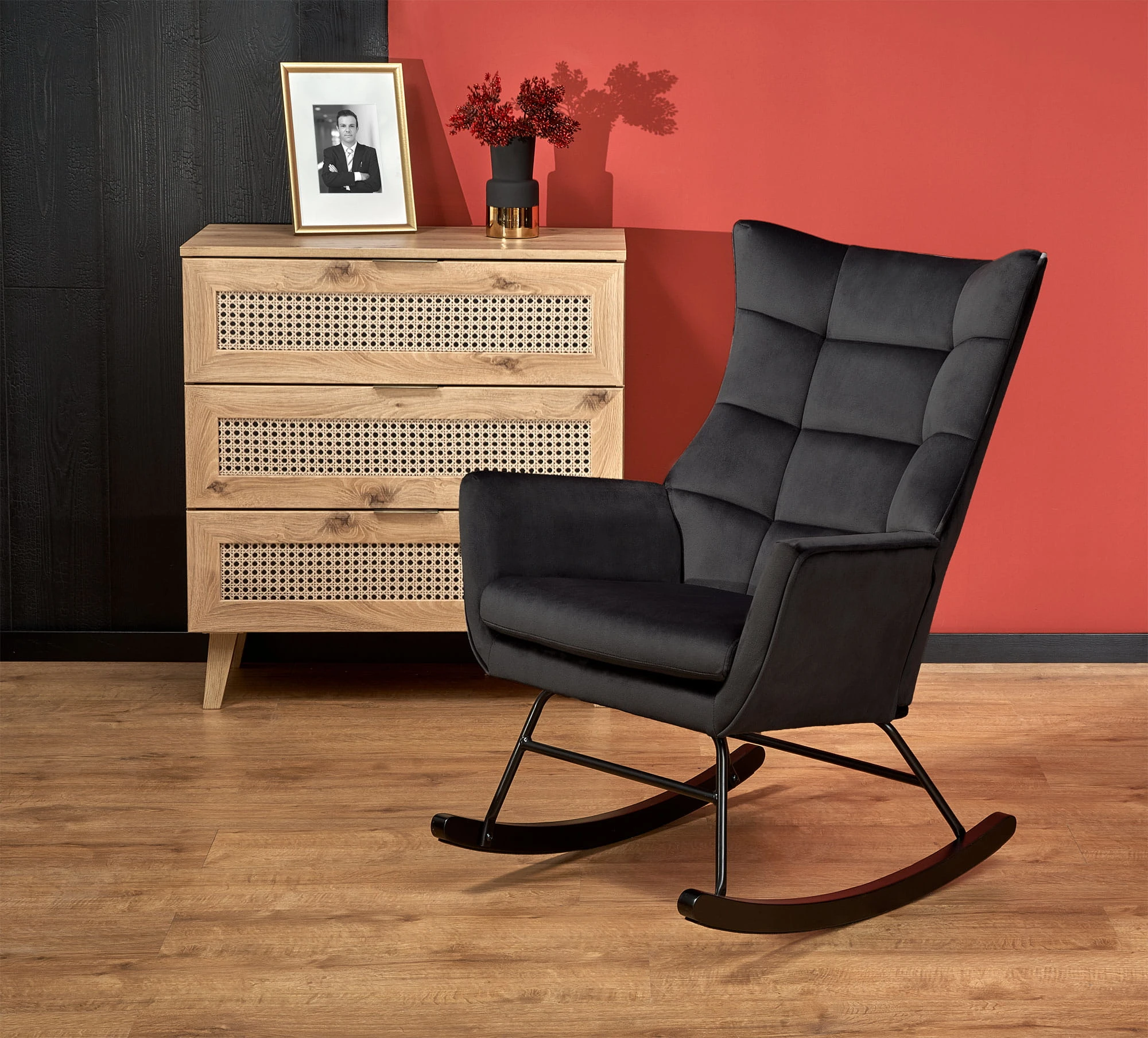 Czarny fotel bujany BAZALTO to elegancki mebel, który zapewnia komfort i relaks. Wyobraź sobie wyjątkową kombinację stylu i funkcjonalności. Fotel ten wykonany jest z solidnej drewnianej konstrukcji, która gwarantuje trwałość i stabilność.