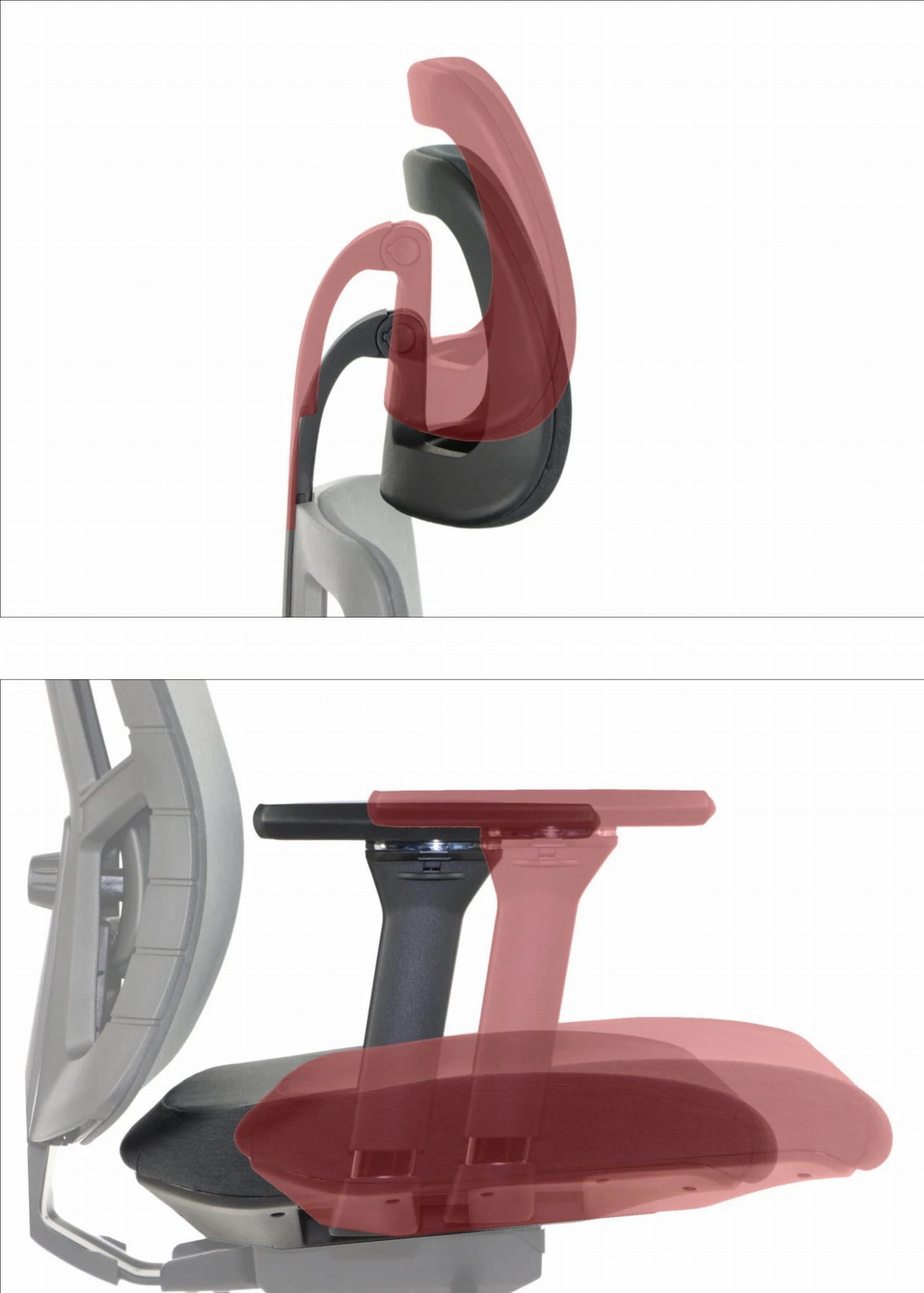 Największym atutem modelu są podłokietniki 4D, umożliwiające regulację w czterech kierunkach: góra–dół, przód–tył, rotacja oraz szerokość. Pozwala to na idealne dopasowanie ich do sylwetki użytkownika, odciążając ramiona i nadgarstki oraz wspierając zdrową, stabilną pozycję niezależnie od długości pracy.