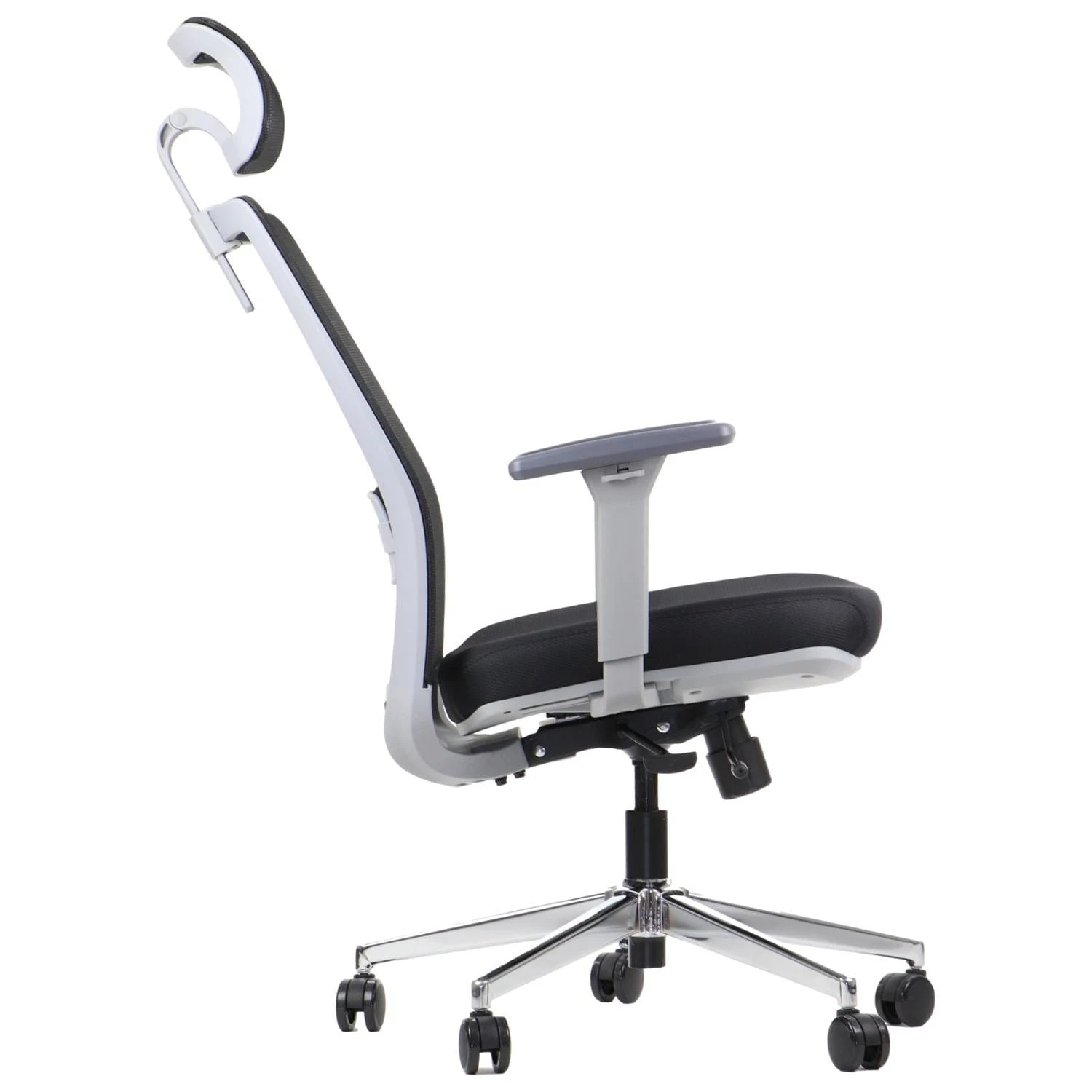Siedzisko tapicerowane jest wytrzymałą tkaniną odporną na ścieranie, a oparcie wykonane z przewiewnej siatki zapewnia odpowiednią cyrkulację powietrza. Regulowane podparcie lędźwiowe oraz zagłówek z możliwością dostosowania wysokości i kąta nachylenia wspierają prawidłową postawę ciała.