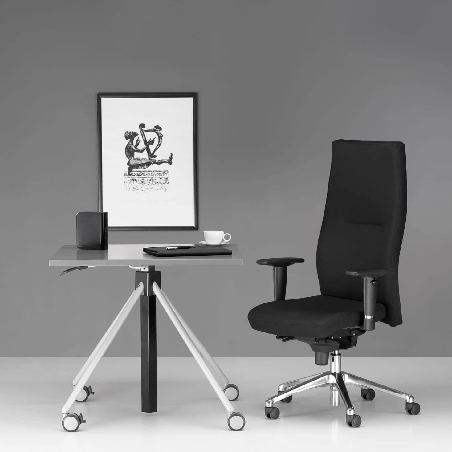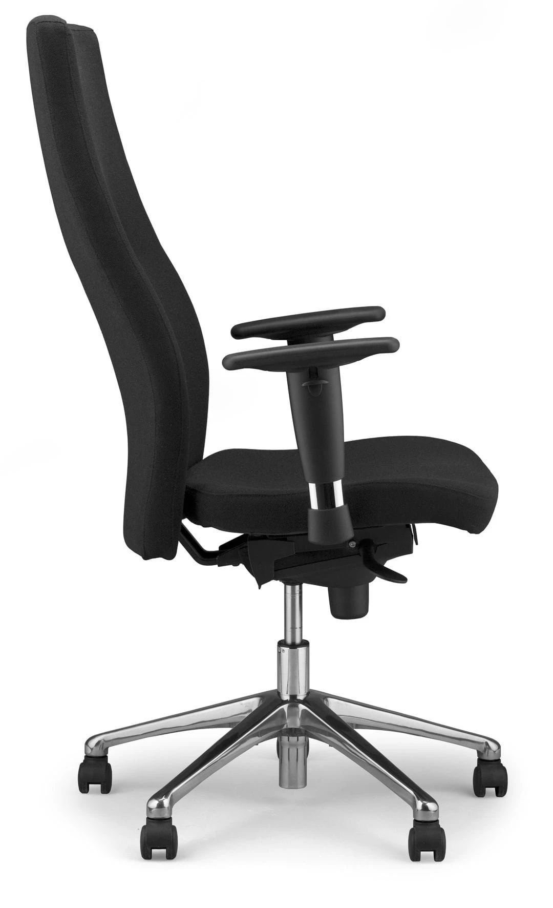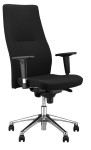 Fotel wyposażony jest w regulowane na wysokość podłokietniki. Połączenie czerni tkaniny z aluminiową ramą oraz chromowanymi elementami podłokietników nadaje fotelowi elegancji.