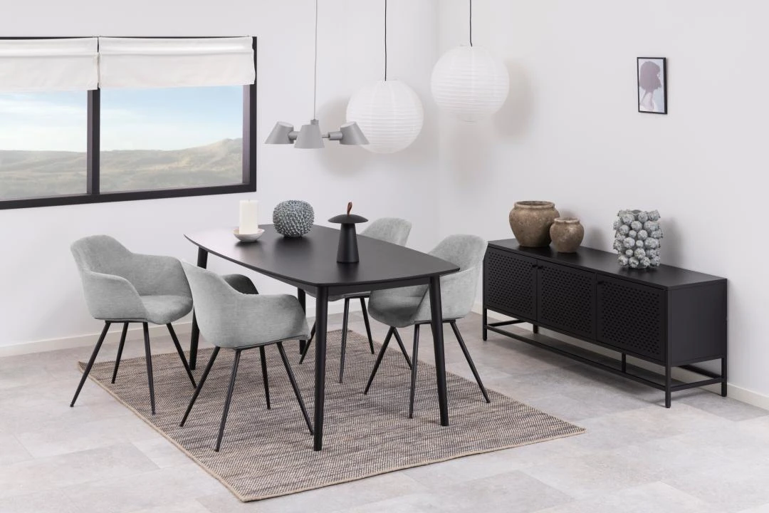 Komoda Newcastle o długości 160 cm to solidny i stylowy mebel do przechowywania, który łączy w sobie funkcjonalność z estetyką. Konstrukcja została wykonana z czarnego metalu, co nadaje komodzie Newcastle solidności i nowoczesnego wyglądu. Wnętrze komody zostało podzielone na różne sekcje, co umożliwia organizację przechowywanych rzeczy w zależności od potrzeb użytkownika. Czarne wykończenie nadaje meblowi elegancji, a jednocześnie sprawia, że jest łatwy do dopasowania do różnych stylów wnętrz. Newcastle posiada elementy dekoracyjne, takie jak metalowe uchwyty, które nie tylko ułatwiają otwieranie drzwi, ale także dodają estetycznego charakteru.