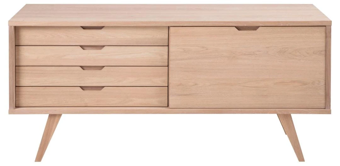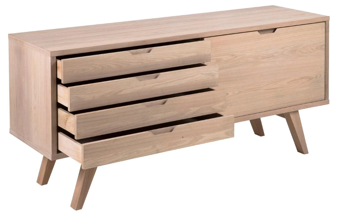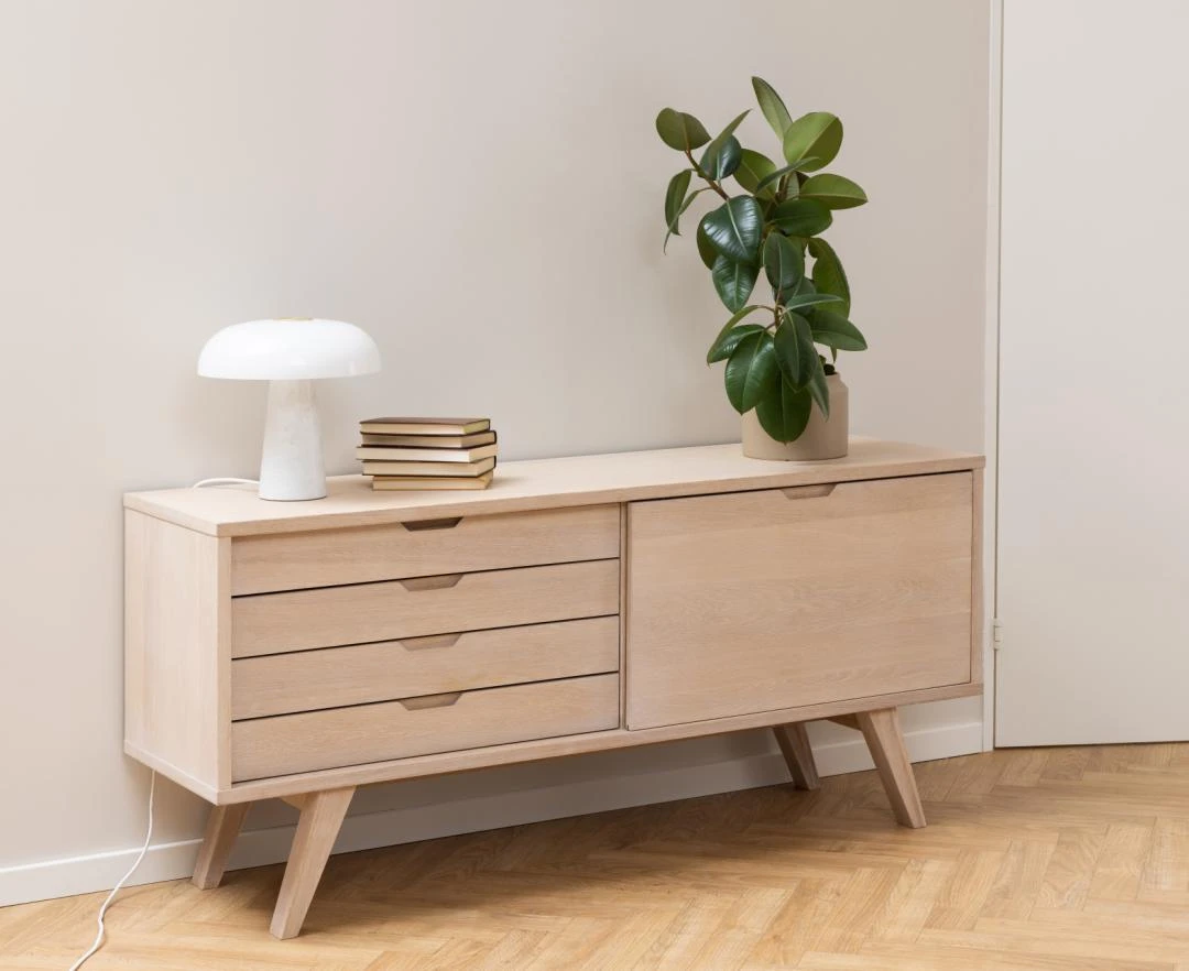 A-Line z fornirem w kolorze białego dębu to nowoczesna komoda która jest idealnym przykładem klasycznego, skandynawskiego designu. Komoda oferuje dużo miejsca do przechowywania dzięki 4 szufladom i 1 drzwiom przesuwnym. Regulowane półki umożliwiają dostosowanie komody do indywidualnych potrzeb. Komoda A-Line to połączenie funkcjonalności i elegancji. Biały pigmentowany fornir dębowy nadaje meblowi naturalny, ale jednocześnie nowoczesny wygląd. Metalowe prowadnice zapewniają płynne i ciche otwieranie szuflad. Zintegrowane uchwyty są nie tylko praktyczne, ale także stanowią ciekawy element dekoracyjny.