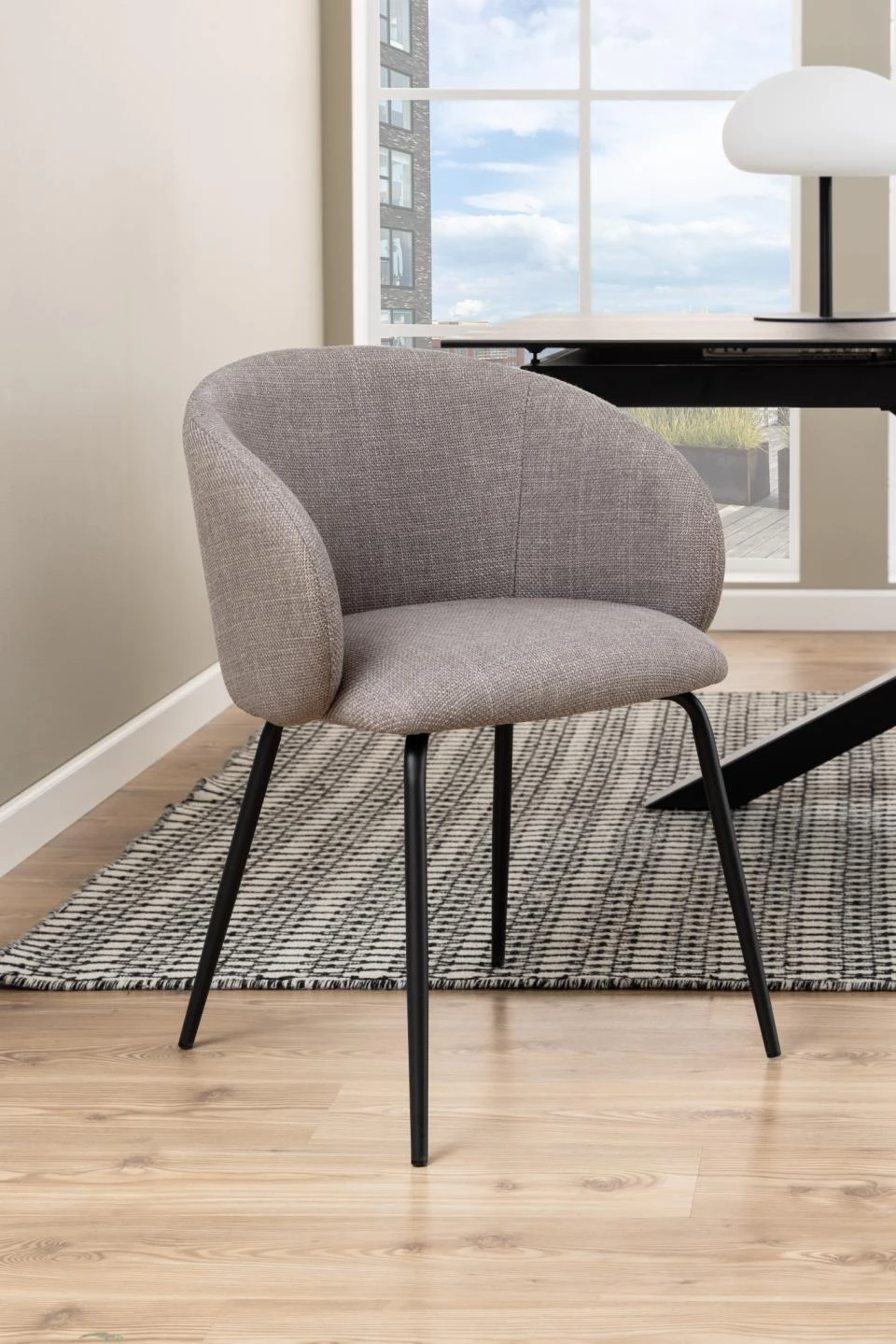 Krzesło Eleanor w odsłonie light grey-brown jest współczesną interpretacją nowoczesnej elegancji, stworzoną z myślą o wnętrzach, które cenią subtelną formę i wyważony styl. Organiczne linie siedziska tworzą harmonijną sylwetkę, która przyciąga wzrok miękkimi przejściami i delikatnie zarysowanymi podłokietnikami. To projekt, który nie narzuca się formą, lecz buduje w pomieszczeniu atmosferę łagodności i dopracowanego smaku. Wykończenie w odcieniu jasnego szaro-brązu nadaje meblowi wizualną lekkość, a strukturalna tkanina o dwutonowym efekcie wprowadza głębię i subtelną grę światła. Smukłe nogi w matowej czerni nie tylko podkreślają elegancki charakter mebla, ale także wprowadzają wyraźny kontrast, dodając całości nowoczesnej dynamiki. To krzesło zaprojektowane tak, aby harmonijnie dopełniać wnętrza o miękkiej estetyce — od nowoczesnych jadalni po przytulne przestrzenie dzienne. Każdy detal został opracowany z precyzją, tak aby forma spotykała się z funkcją w idealnych proporcjach. Model Eleanor łączy luksusową prostotę z ponadczasową lekkością, oferując mebel, który zarówno zachwyca, jak i pozostaje niezwykle praktyczny na co dzień.