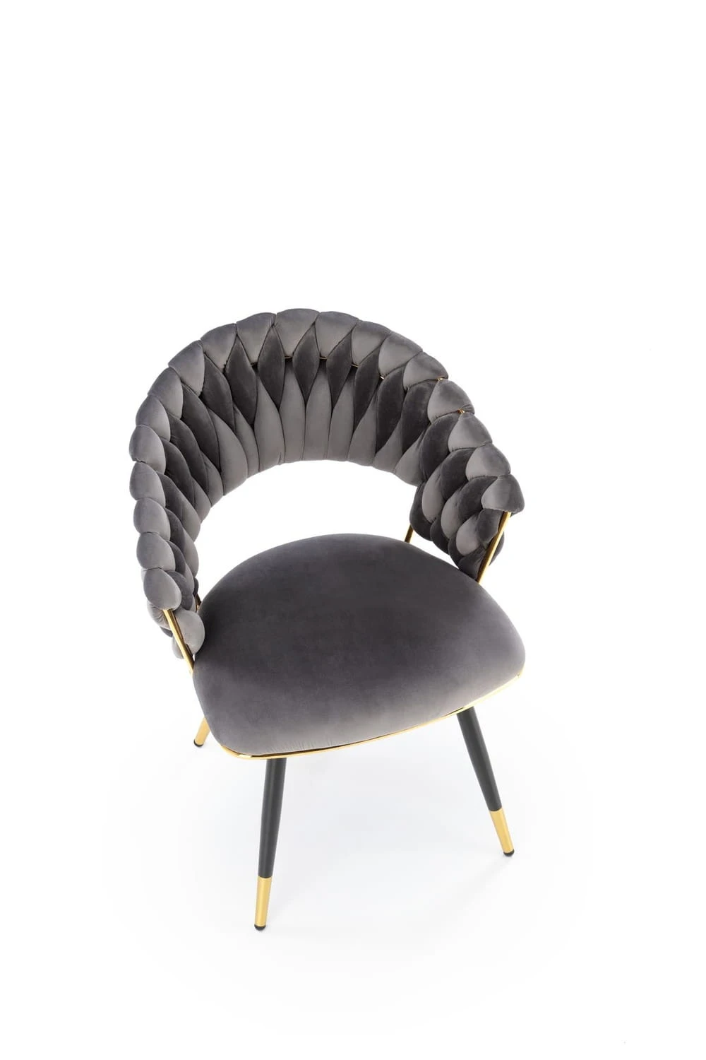 Nogi i stelaż są chromowane - kolor złoty - oraz czarne malowane metodą proszkową. Tkanina bluvel to kolor popielaty - kod koloru Bluvel 14.