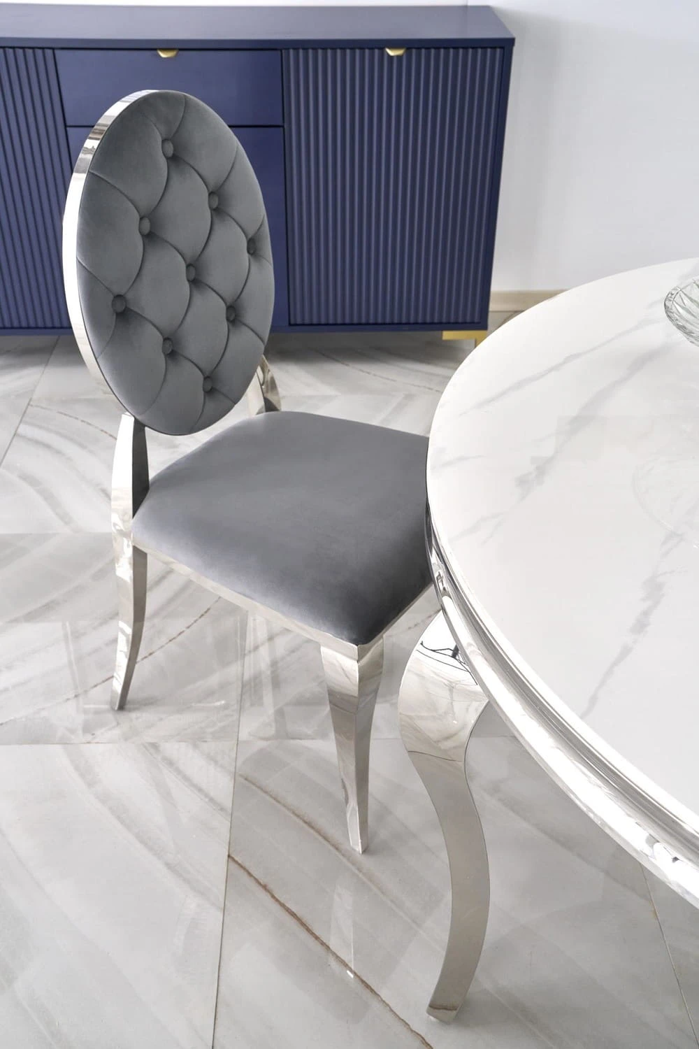 Krzesło K555 łączy elegancję stylu glamour z nowoczesnym wykończeniem. Owalne, pikowane oparcie nawiązuje do klasycznych form, a srebrne nogi ze stali nierdzewnej nadają całości lekkości i prestiżowego charakteru. Tapicerka z miękkiego weluru w popielatym odcieniu sprawia, że krzesło doskonale prezentuje się zarówno w jadalni, salonie, jak i w reprezentacyjnych wnętrzach komercyjnych, takich jak salony piękności czy butiki.