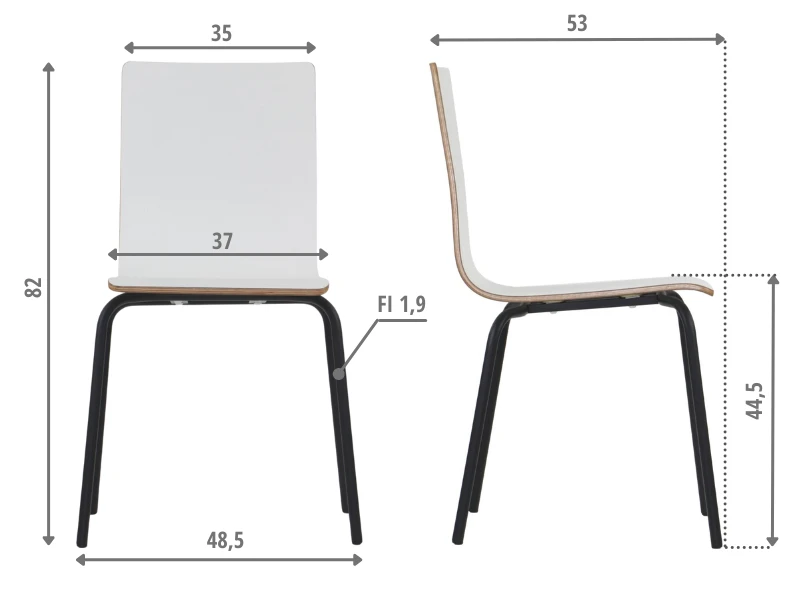 Siedzisko oraz oparcie to jedna całość wykonana ze sklejki liściastej formowanej na gorąco o wygodnym profilu. Sklejka pokryta jest laminatem - ranty są szlifowane i ukazują naturalny przekrój.