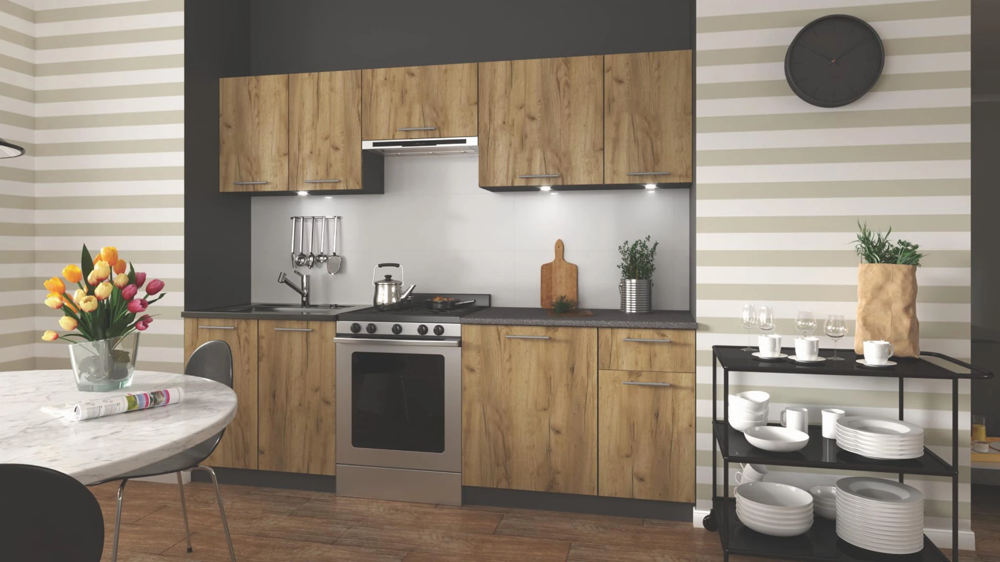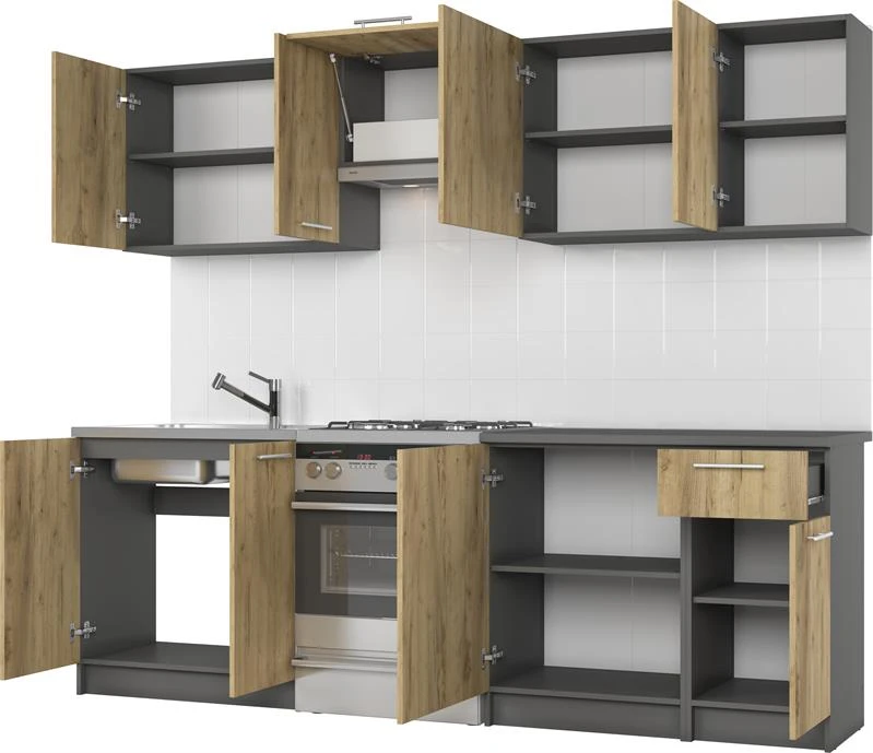 Daria 240 o frontach w kolorze dąb craft, korpusie w kolorze antracyt oraz blacie w tym samym kolorze to kuchnia do samodzielnego montażu o nowoczesnej stylistyce. Kuchnia przeznaczona jest do pomieszczeń średnich oraz mniejszych.