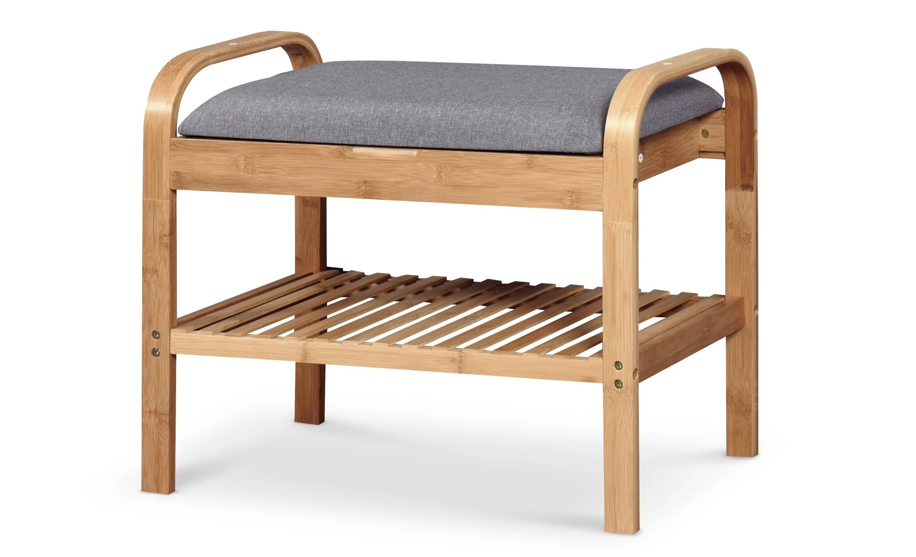 Stojak posiada miękkie siedzisko tapicerowane wysokogatunkową tkaniną upiększoną eleganckim pikowaniem trzema dużymi guzikami. Solidny korpus ławeczki jest wykonany z litego drewna bambusowego, które bardzo dobrze komponuje się z popielatym kolorem tapicerki siedziska.
