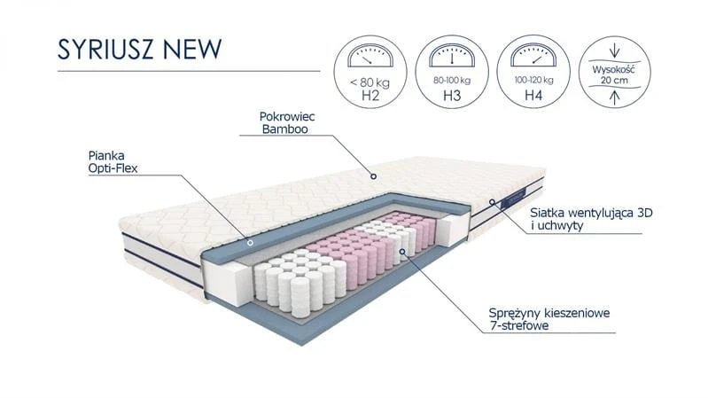Budowa materaca ma niebagatelny wpływ na jego użytkowanie. W Syriuszu jako nośnik służą sprężyny kieszeniowe 7-strefowe. Są one sprężyste i nie odkształcają się w czasie użytkowania. Dodatkowo równo rozkładają ciężar użytkownika dzięki zastosowaniu specjalnych przekładek tapicerskich oraz płyty z pianki Opti-Flex.