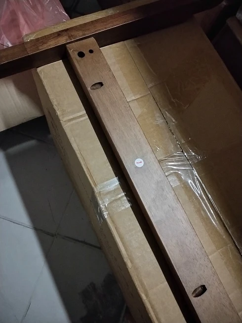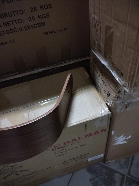 - skręcone i częściowo rozkręcone (kołki niewyjęte z elementu C, z instrukcji montażu oraz stopki niewykręcone z nóg), drobne uszkodzenia transportowe w postaci malutkich rysek na drewnianych elementach (patrz przykładowe zdjęcia), w 100% nowe i kompletne, pełna gwarancja
