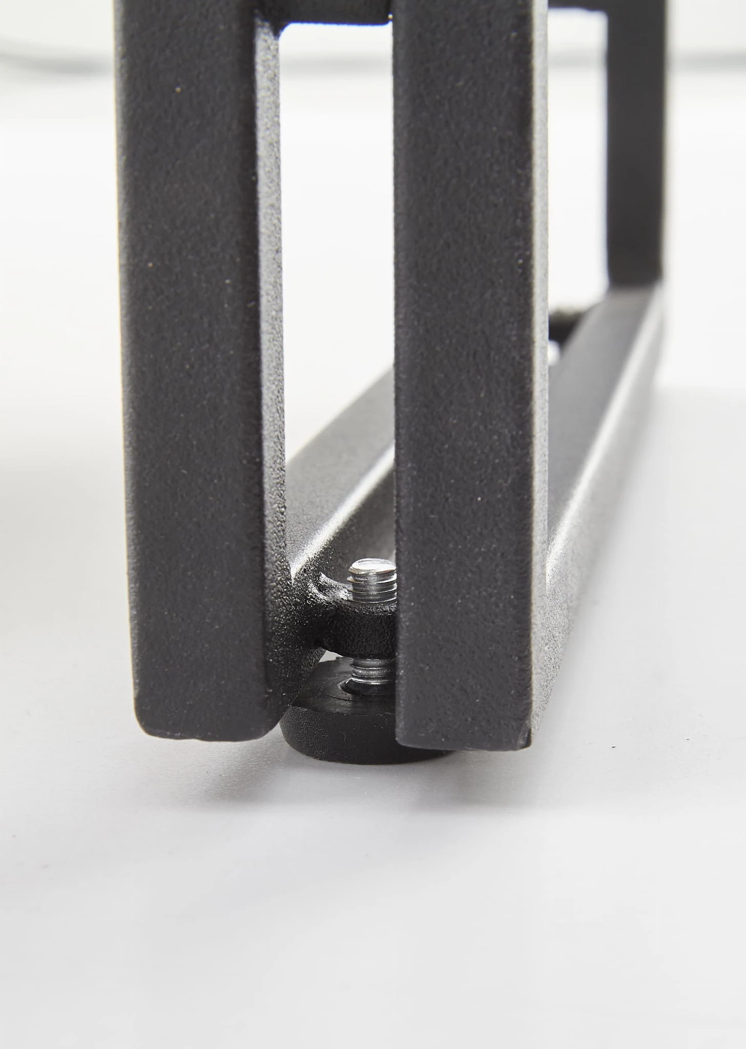 Nogi regału Bolivar REG2 posiadają zabezpieczenia przeciwdziałające przesuwaniu się oraz zarysowaniu podłogi. Stelaż wykonany jest ze stali pomalowanej proszkowo na kolor czarny.