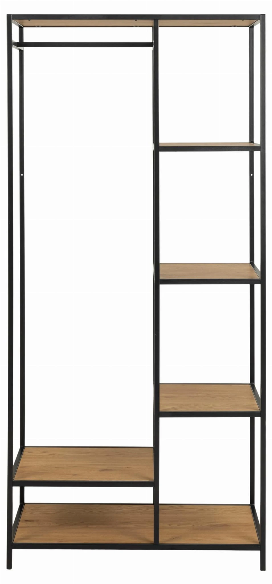 Konstrukcja regału opiera się na metalowym stelażu malowanym proszkowo na czarno, który zapewnia stabilność i trwałość. Półki wykonane są z płyty MDF pokrytej laminatem imitującym dziki dąb, co nadaje meblowi naturalny i surowy charakter. Regał posiada sześć półek, co zapewnia dużo miejsca do przechowywania.