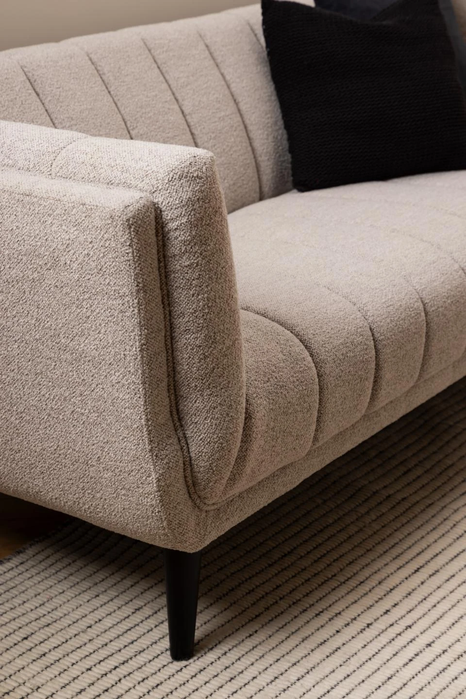 Tapicerka w modnej strukturze bouclé w kolorze beżowym nadaje sofie przytulny i luksusowy charakter. Całość osadzona jest na smukłych, czarnych nogach z drewna, które dodają lekkości i kontrastu.
