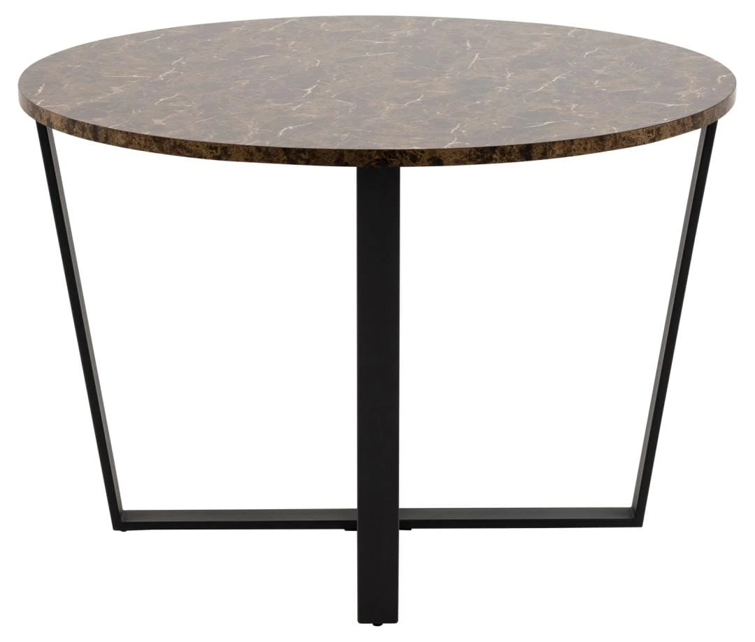 Korpus stołu Amble został wykonany ze stali pomalowanej na kolor czarny, blat natomiast to płyta MDF imitująca brązowy marmur.