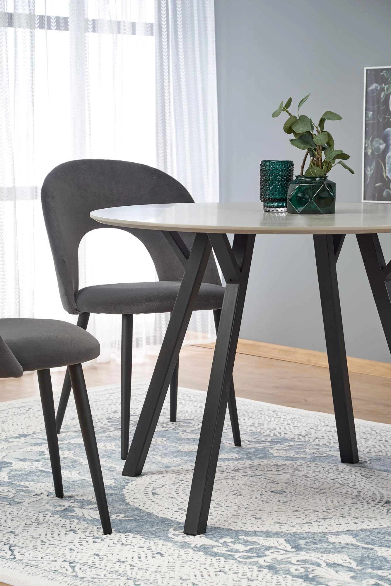 Połączenie szarości blatu oraz czerni nóg stołu jest spójne i dobrze się uzupełnia z innymi kolorami obecnymi w pomieszczeniu.