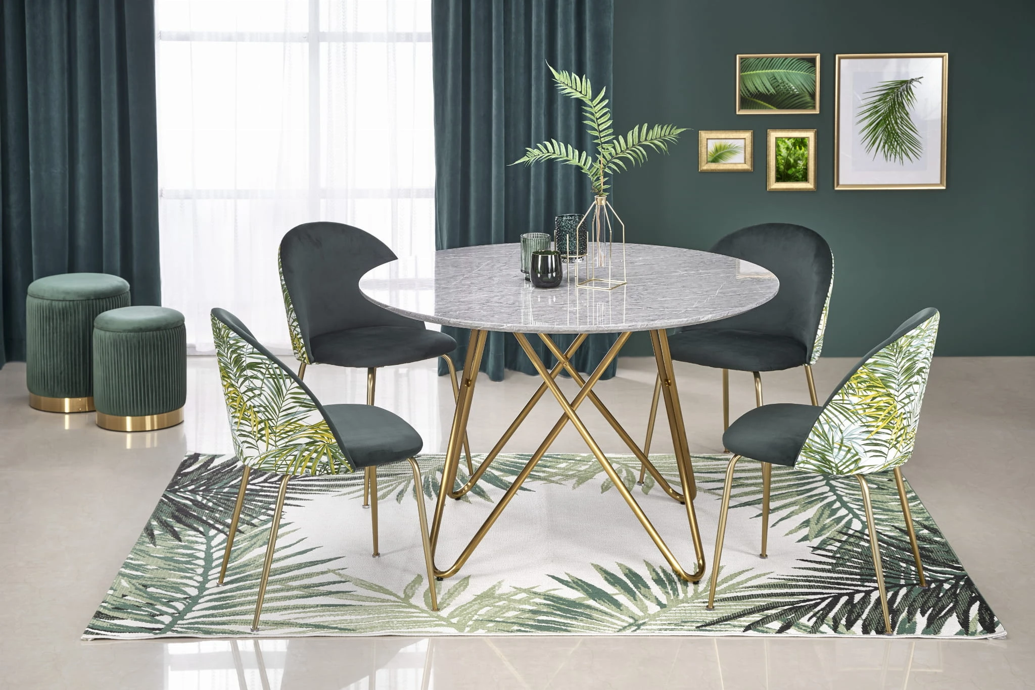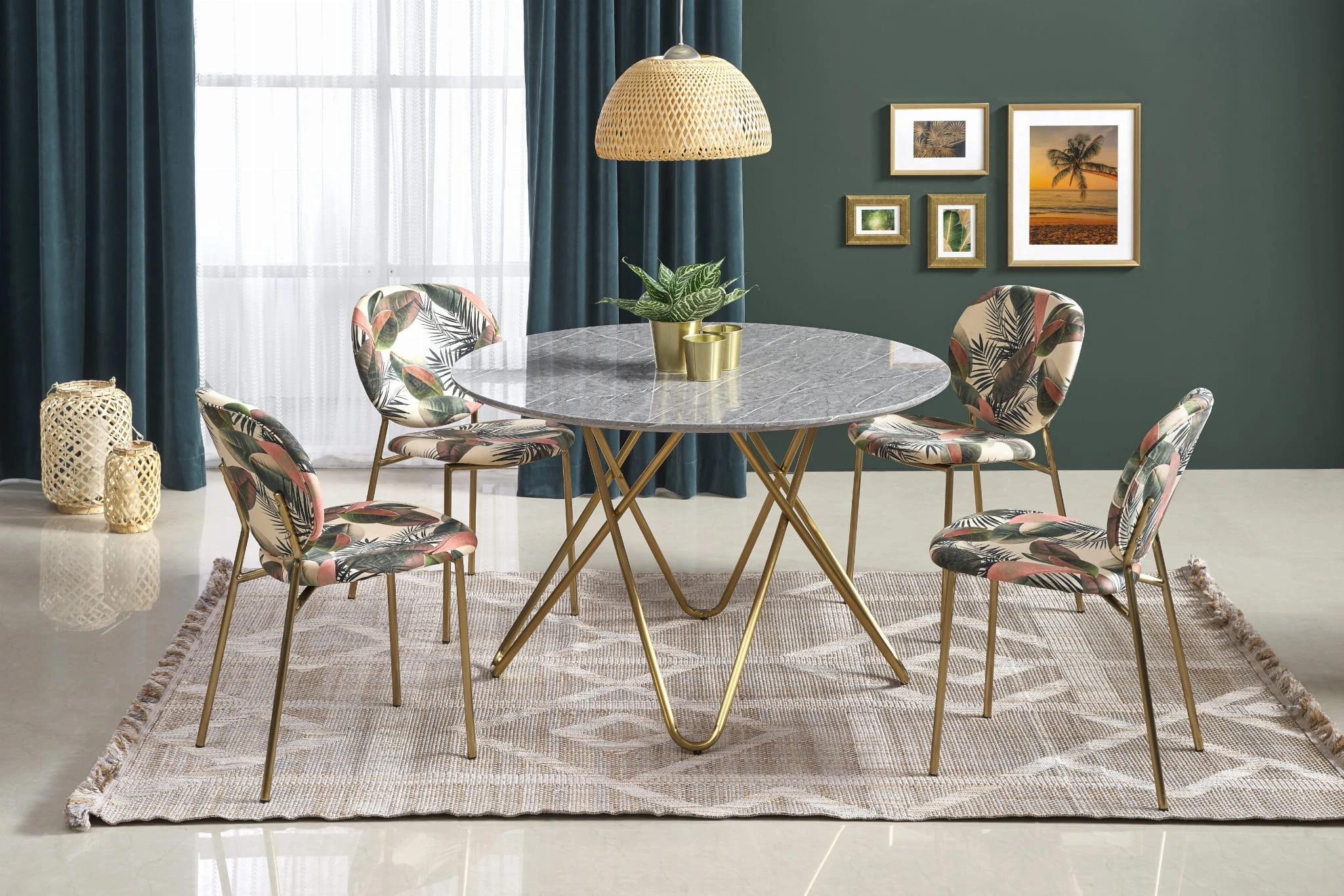 Zestawienie popielatego marmuru ze złotem to ponadczasowa kombinacja, która świetnie wygląda w jasnych wnętrzach jako mocny akcent, ale równie dobrze sprawdzi się w bardziej kontrastowych aranżacjach z czernią i grafitem. Ten stół łatwo dopasujesz do krzeseł tapicerowanych, welurowych oraz modeli na czarnych lub złotych stelażach.