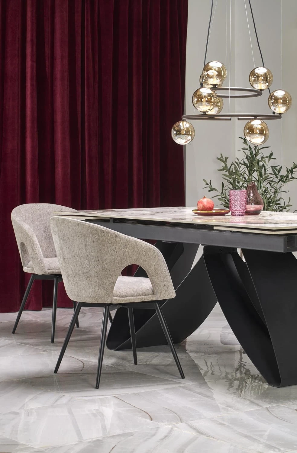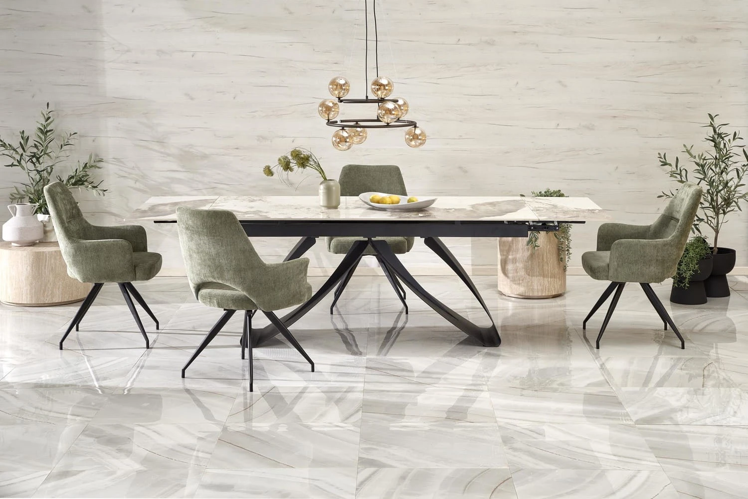 Stół rozkładany HILARIO marki Halmar to elegancki mebel o nowoczesnym designie, idealny do współczesnych wnętrz. Blat wykonany ze spieku w kolorze białego marmuru prezentuje się niezwykle stylowo, wnosząc do pomieszczenia luksusowy i wyrafinowany charakter. Spiek, jako materiał trwały i odporny na zarysowania, wysoką temperaturę oraz działanie wilgoci, sprawia, że stół jest wyjątkowo praktyczny i łatwy w utrzymaniu czystości.