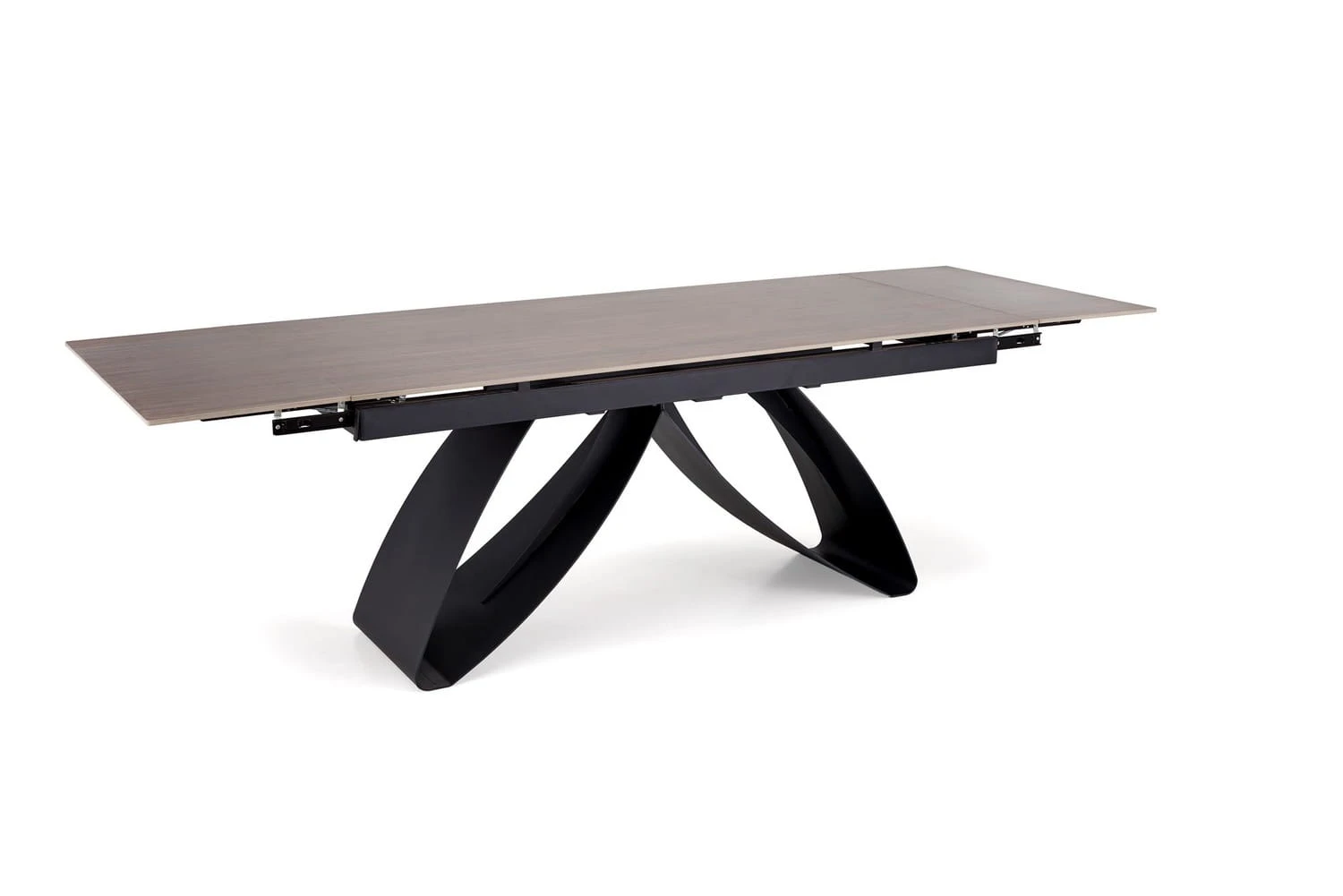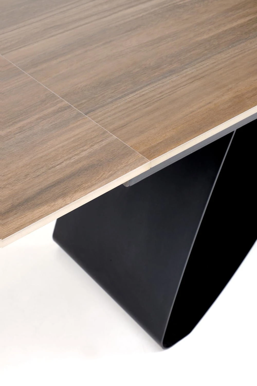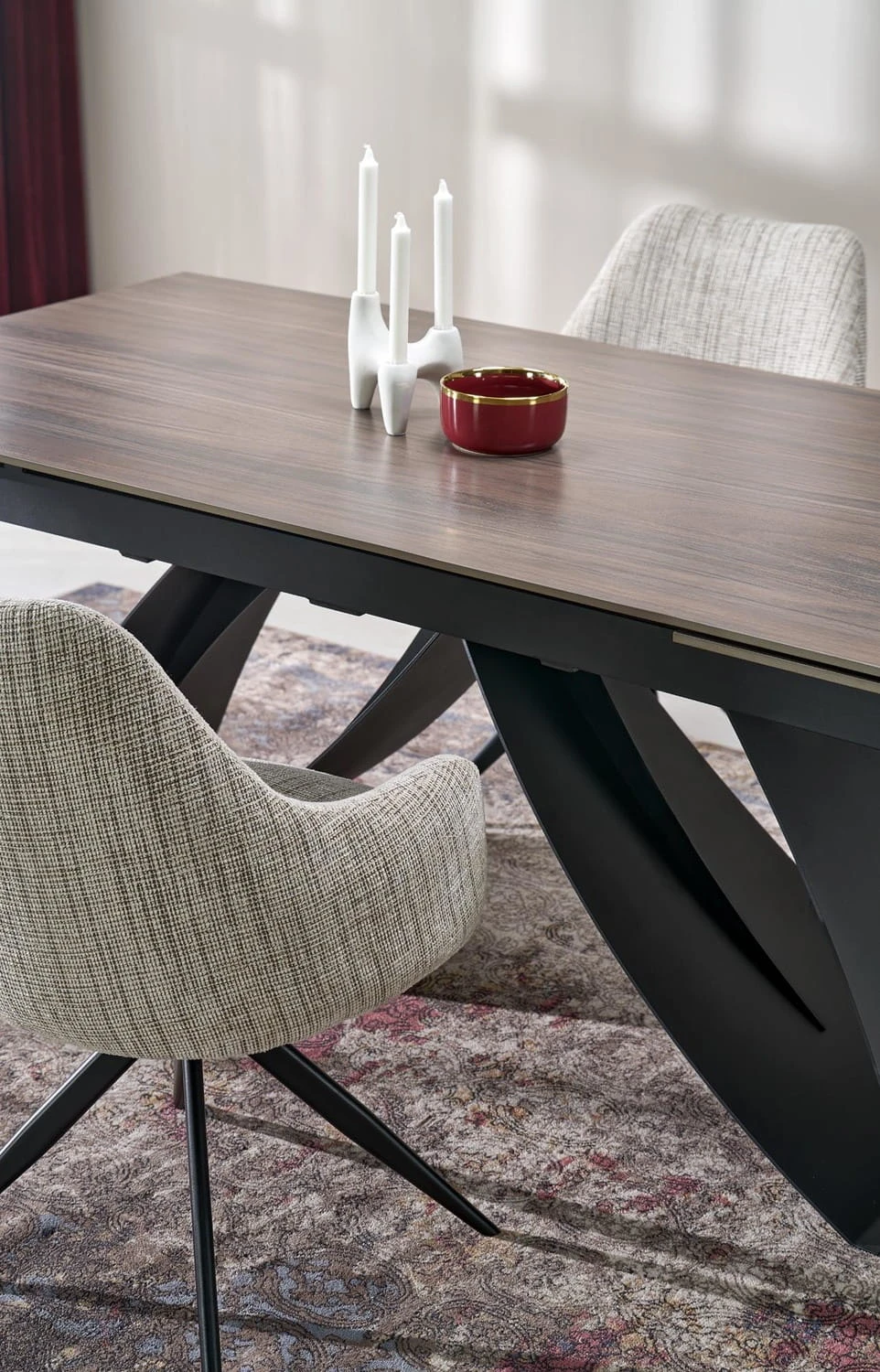 Stół rozkładany HILARIO marki Halmar to elegancki mebel o nowoczesnym designie, idealny do współczesnych wnętrz. Blat wykonany ze spieku w kolorze orzechowym prezentuje się niezwykle stylowo, wnosząc do pomieszczenia ciepły, naturalny i wyrafinowany charakter. Spiek, jako materiał trwały i odporny na zarysowania, wysoką temperaturę oraz działanie wilgoci, sprawia, że stół jest wyjątkowo praktyczny i łatwy w utrzymaniu czystości.