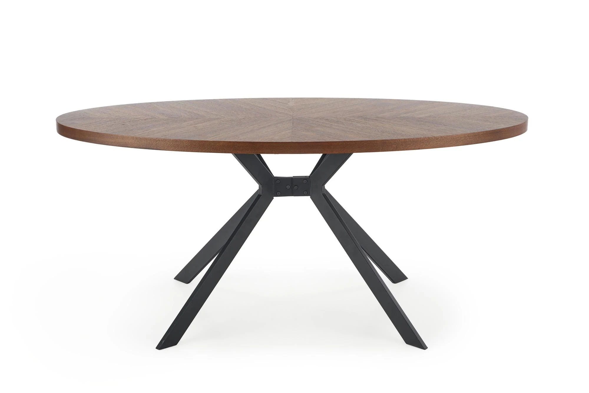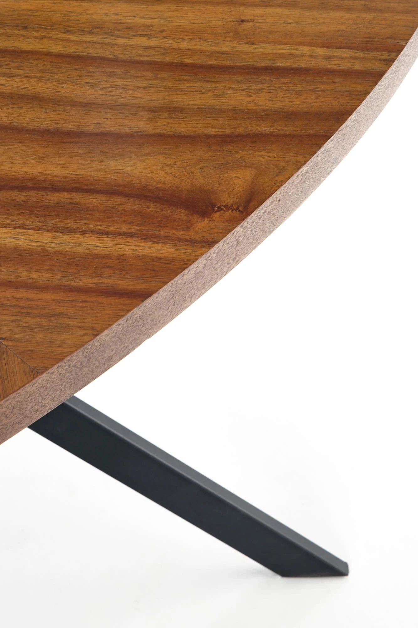 Połączenie pięknej okleiny drewna orzechowego w jasnych i ciemniejszych odcieniach prezentuje się elegancko i stylowo. Blat dobrze współgra z matowym czarnym wykończeniem nóg stołu.