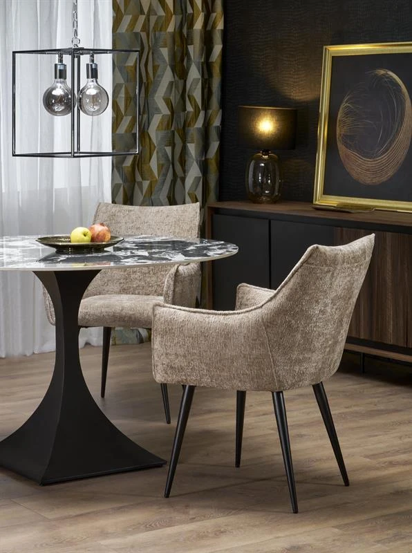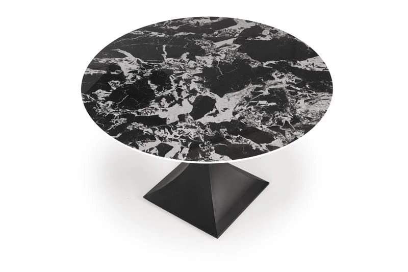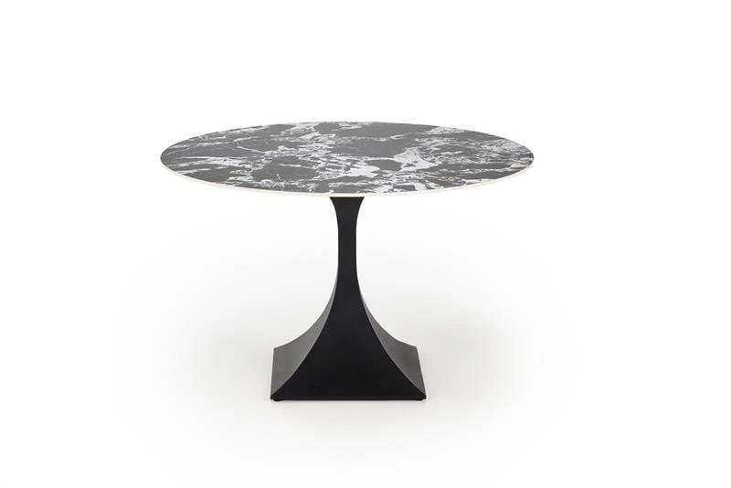 Stół Manuel od Halmar to elegancki mebel o nowoczesnym i wyrafinowanym designie. Charakteryzuje się okrągłym blatem o średnicy 120 cm, o wzorze przypominającym czarny marmur w ciemnym kolorze z jasnymi, naturalnymi żyłkami. Taki marmurowy efekt nadaje stołowi luksusowego charakteru i sprawia, że staje się centralnym punktem każdej jadalni czy salonu.