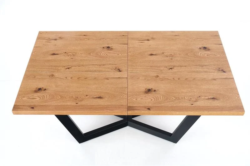 Blat stołu Massive wykonany jest z płyty meblowej pokrytej warstwą dębowego forniru o pięknym słoju. Obrzeża blatu wykonane są z litego drewna dębowego.