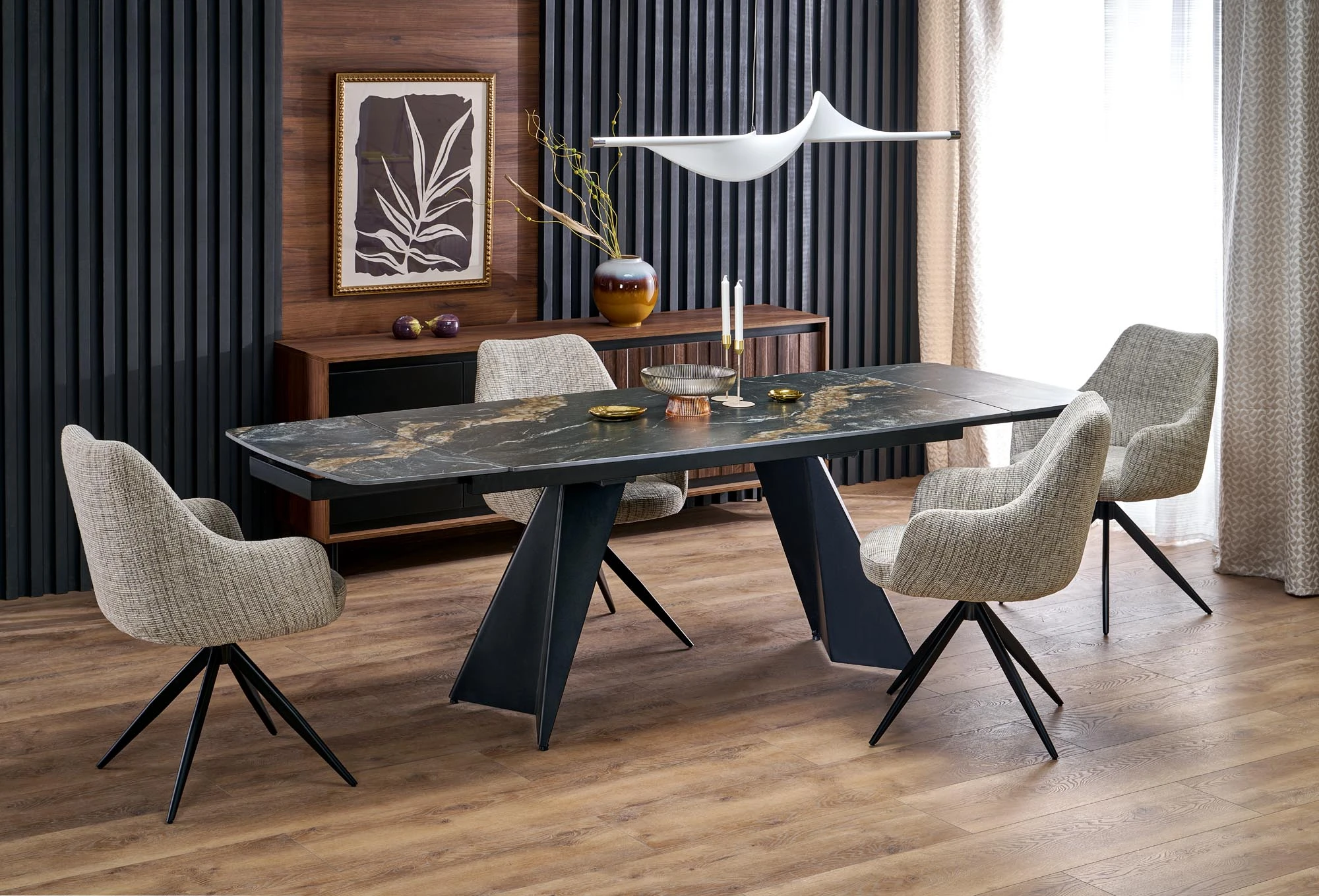 Szukasz eleganckiego i funkcjonalnego stołu, który podkreśli charakter Twojego wnętrza? Stół rozkładany ARMANI marki Halmar to połączenie nowoczesnego designu, najwyższej jakości wykonania i wyjątkowej estetyki. Jego czarny blat ze spieku imitującego marmur prezentuje się niezwykle luksusowo, dodając wnętrzu prestiżu i ponadczasowego stylu.
