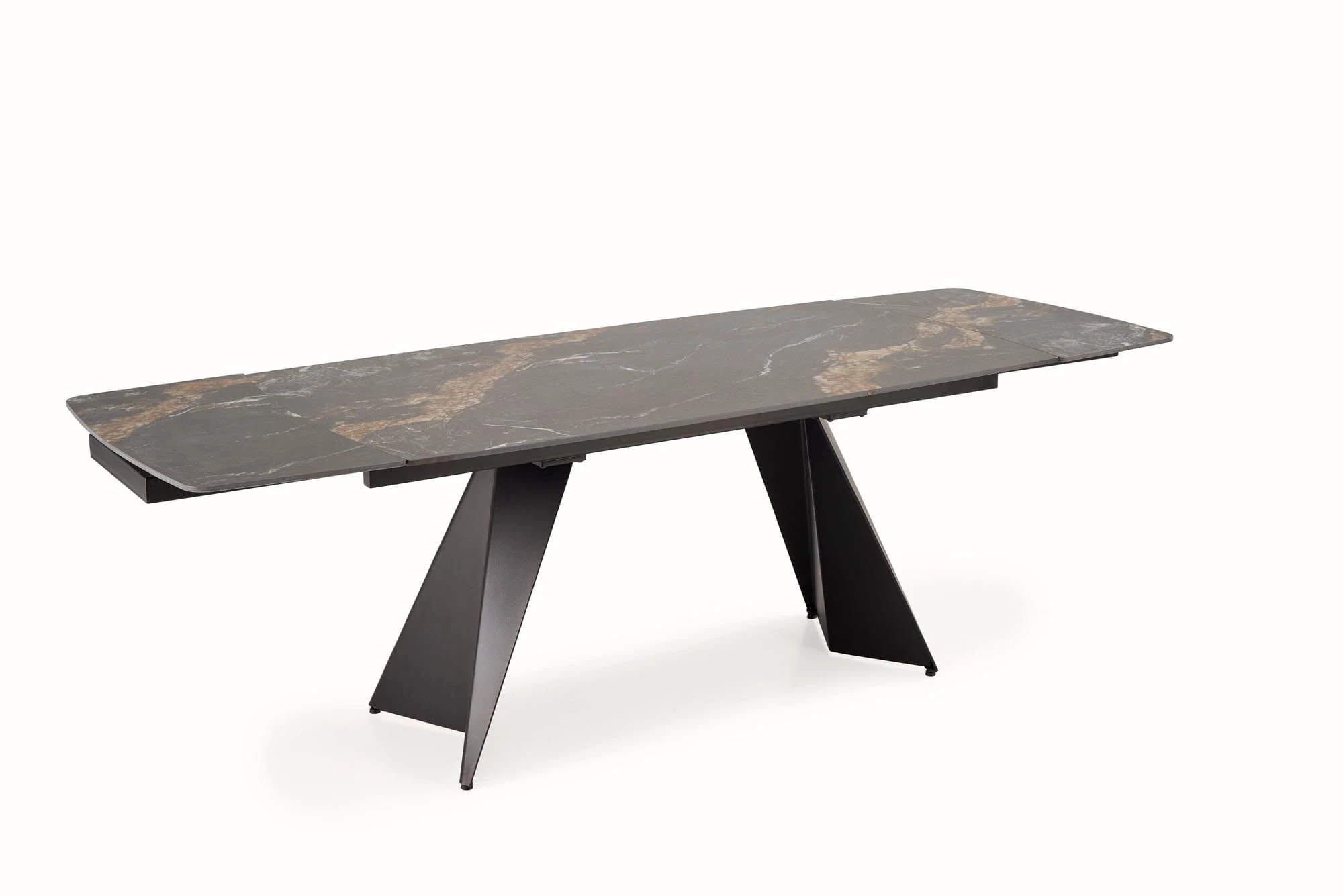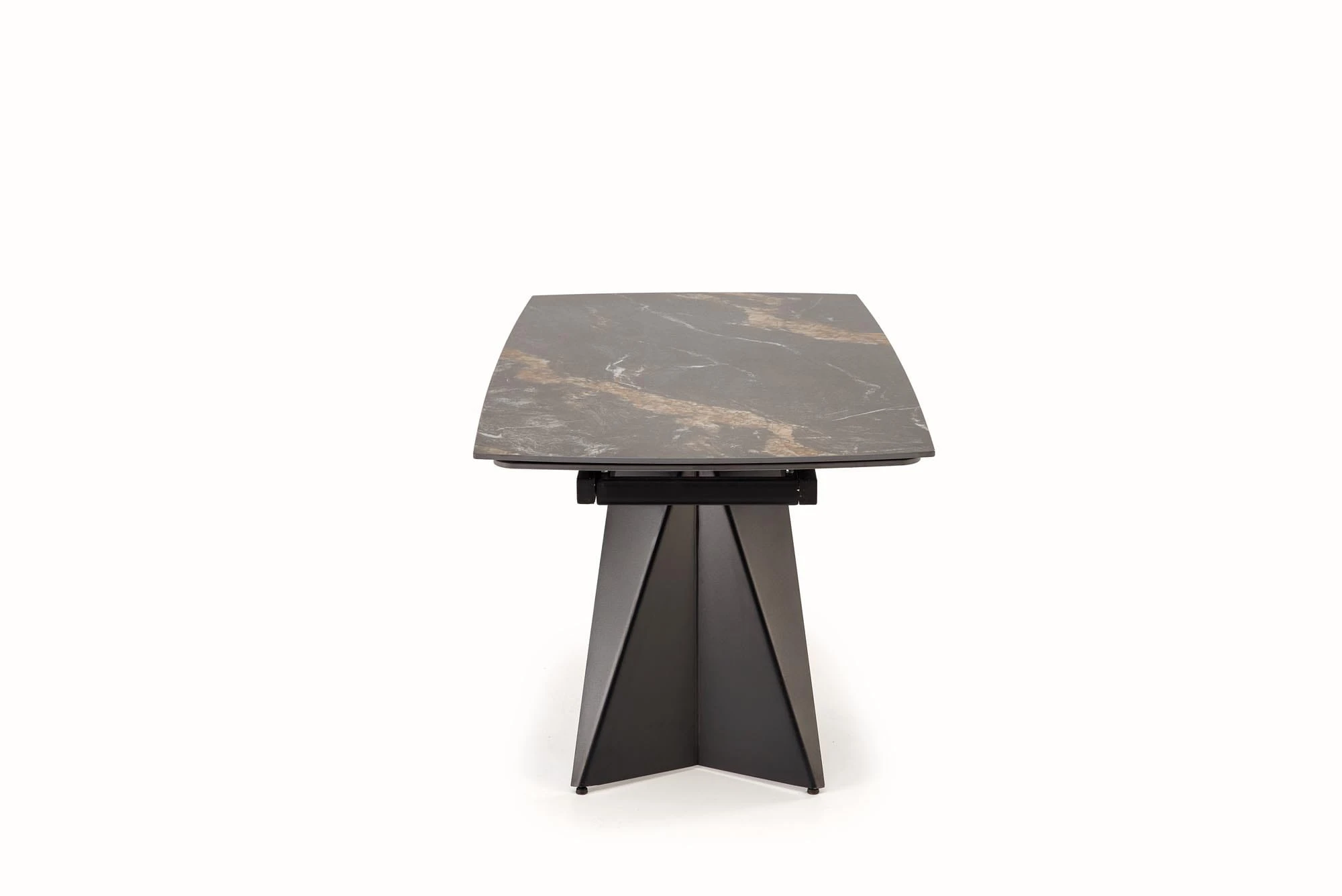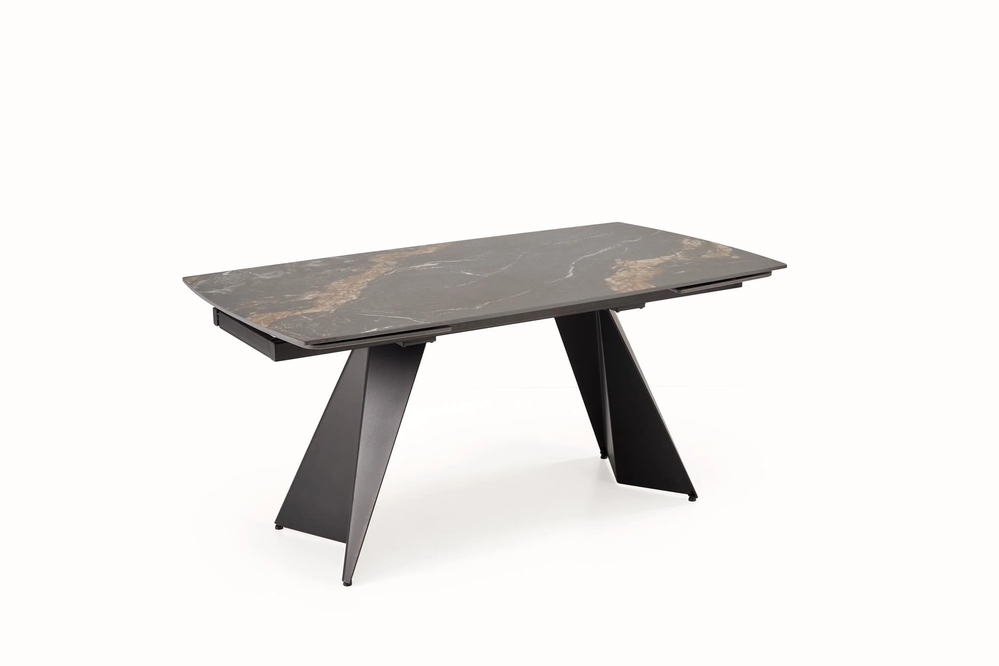 Blat wykonany został z trwałego spieku o strukturze nawiązującej do naturalnego marmuru. Połączenie głębokiej czerni i delikatnych żyłowań sprawia, że stół doskonale wpisuje się w nowoczesne, loftowe i eleganckie aranżacje.