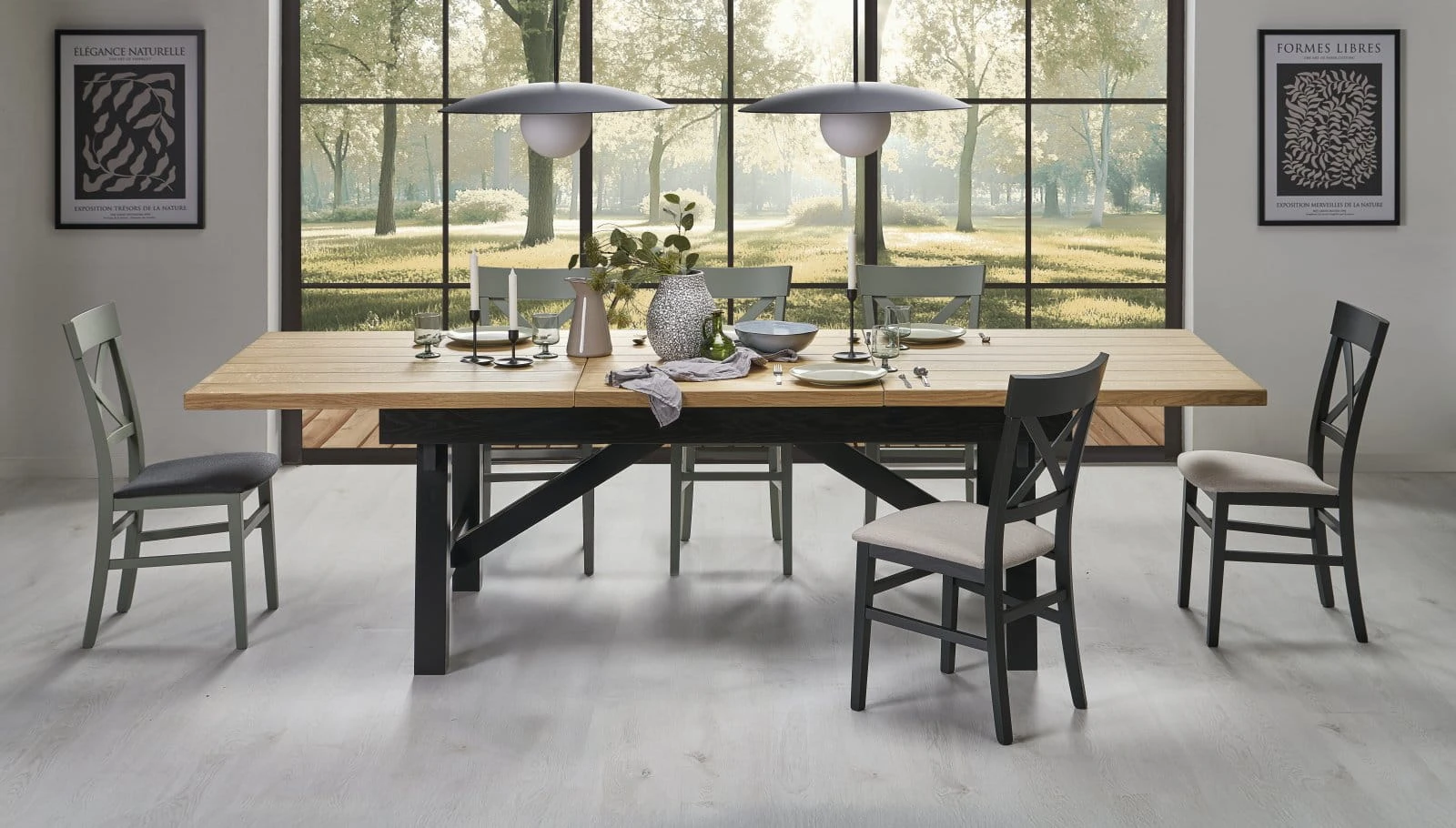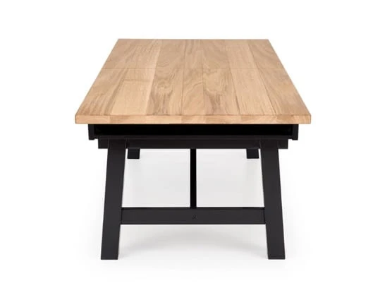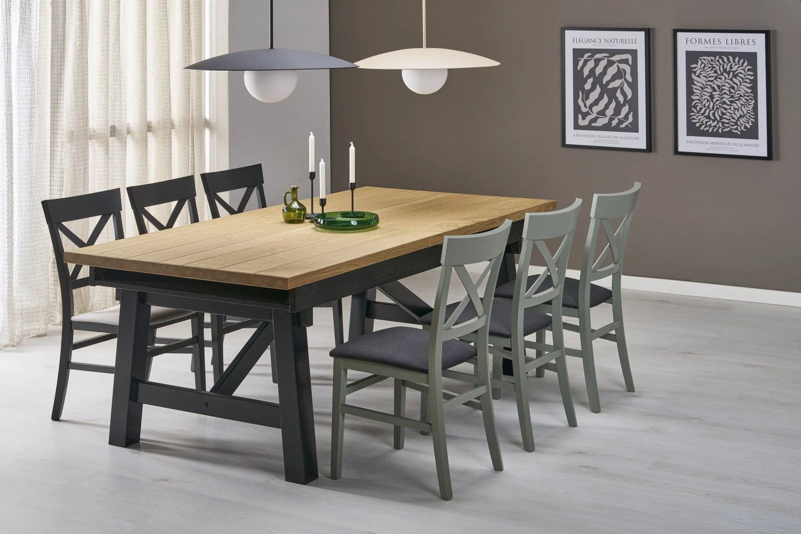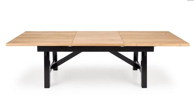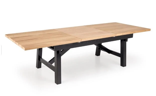 Stół rozkładany FIESTA marki Halmar to elegancki mebel łączący nowoczesny design z funkcjonalnością. Jego prostokątny blat o wymiarach 200 × 100 cm można rozłożyć do 280 cm, co umożliwia komfortowe użytkowanie przez 8 do 12 osób. Blat wykonany jest z płyty MDF pokrytej 5 mm lamelami dębowymi, z obrzeżami z litego drewna, co nadaje mu naturalny wygląd i trwałość. Stół opiera się na solidnych, bukowych nogach malowanych na kolor czarny, dodających nowoczesnego charakteru. Dzięki swojej uniwersalnej stylistyce, stół FIESTA doskonale wpasuje się zarówno w jadalnię, jak i salon, stając się centralnym punktem spotkań rodzinnych i towarzyskich.