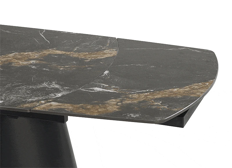 Podstawa stołu to solidna konstrukcja ze stali malowanej proszkowo na kolor czarny, o miękkich, zaokrąglonych liniach nadających całości nowoczesny, rzeźbiarski charakter. Dzięki przemyślanemu systemowi rozkładania, blat można z łatwością powiększyć, co czyni Forum idealnym rozwiązaniem zarówno do mniejszych, jak i przestronnych jadalni.