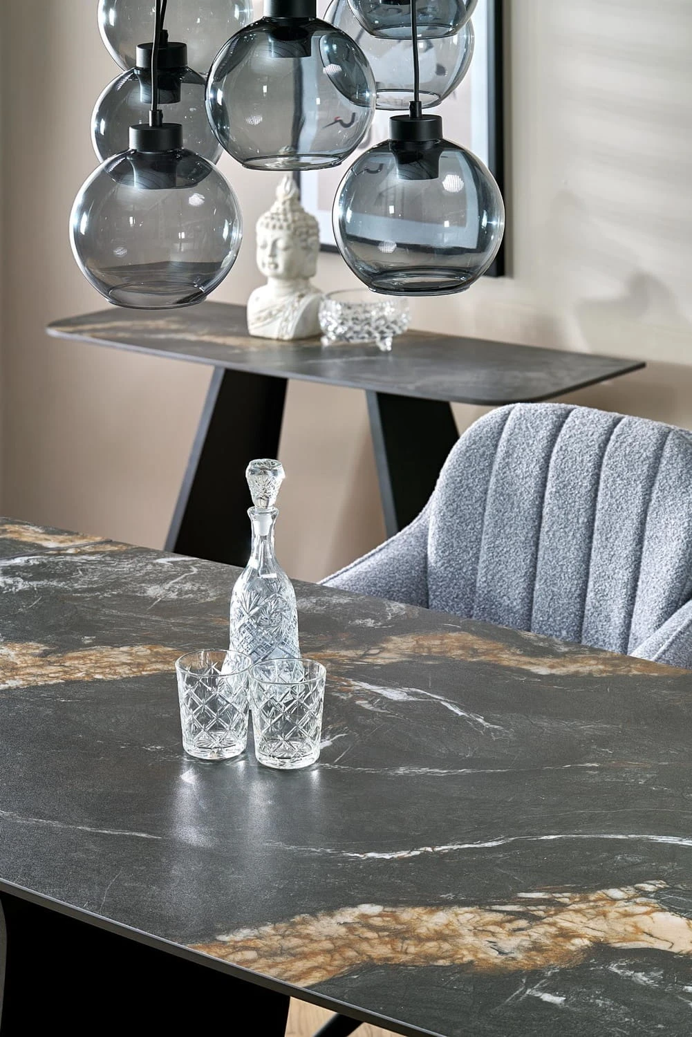Stół Forum marki Halmar to wyjątkowo efektowny mebel, który łączy nowoczesne wzornictwo z luksusowym wykończeniem i wysoką funkcjonalnością. Jego rozkładany blat wykonano ze spieku kwarcowego o głębokiej, kamiennej kolorystyce z subtelnymi, naturalnymi żyłkami w odcieniach brązu i szarości. Powierzchnia jest odporna na zarysowania, wilgoć oraz wysoką temperaturę, co sprawia, że stół doskonale sprawdza się w codziennym użytkowaniu.