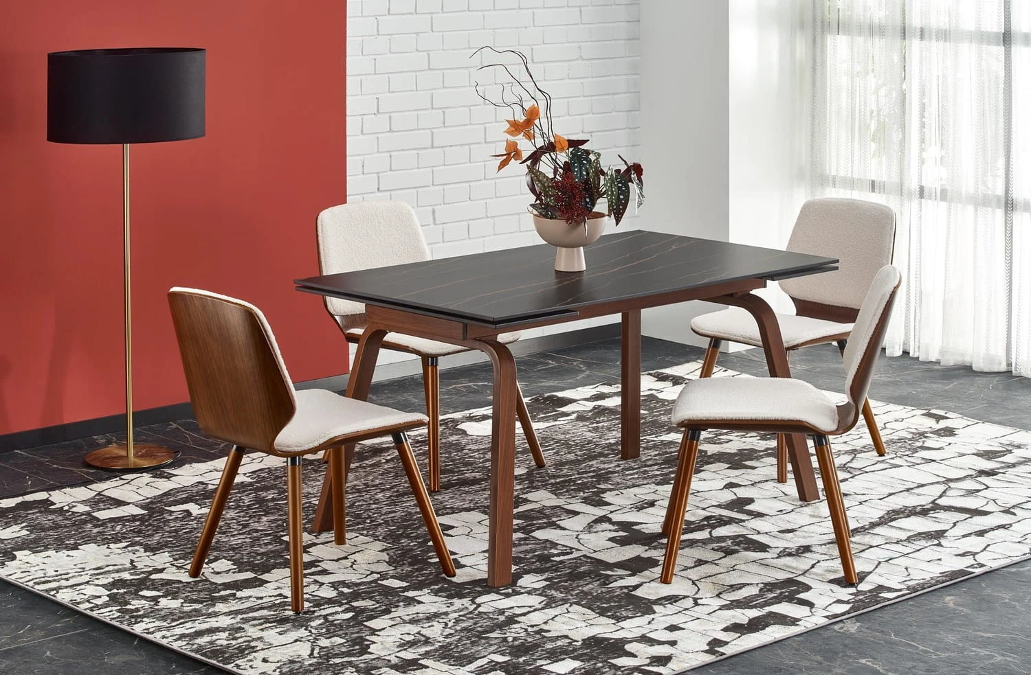 Nowoczesny stół rozkładany Lozano łączy elegancję i funkcjonalność. Blat wykonany ze spieku w odcieniu czarnego marmuru prezentuje się wyjątkowo efektownie i prestiżowo, nadając każdej jadalni lub salonowi stylowego charakteru. Orzechowy kolor nóg ze stali malowanej proszkowo tworzy elegancki kontrast z marmurowym blatem, co podkreśla designerski charakter mebla.
