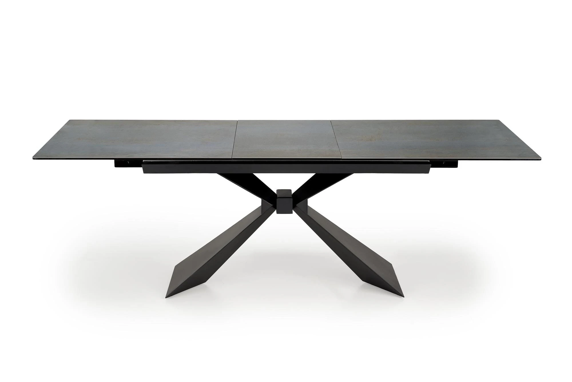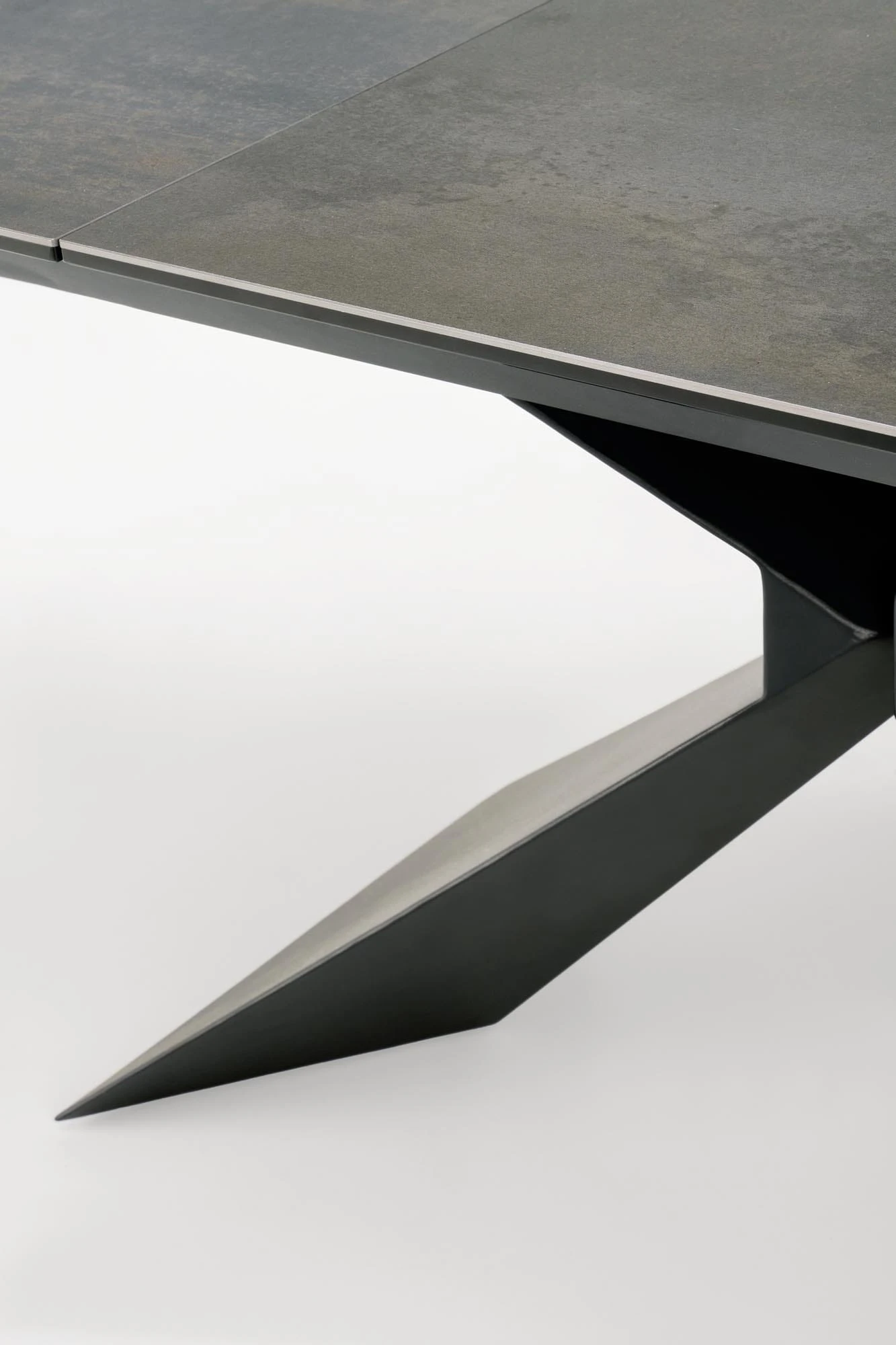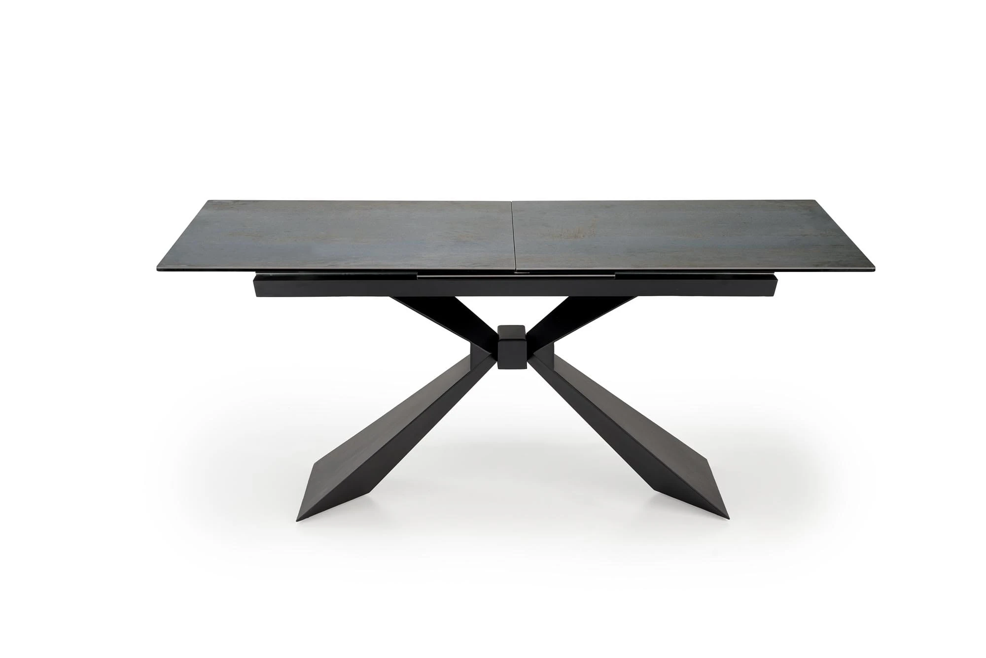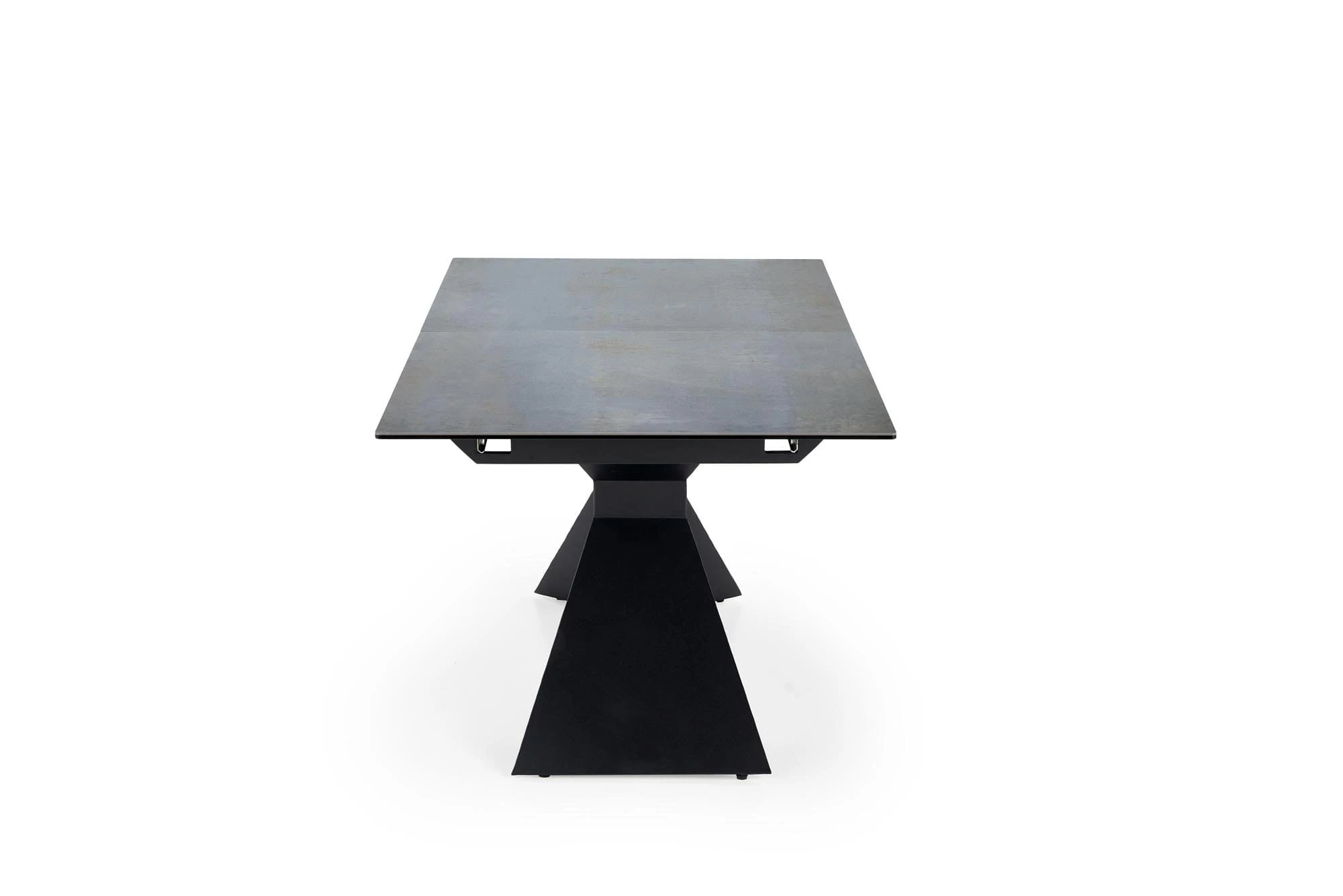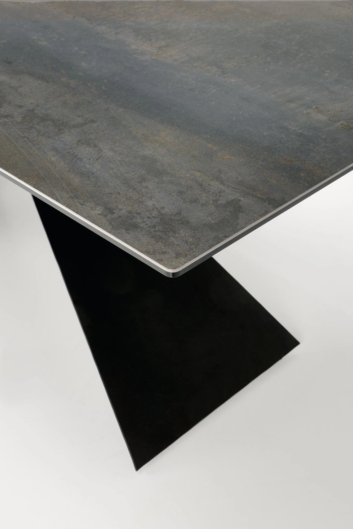 Blat wykonany ze spieku ceramicznego i szkła łączy trwałość z estetyką — materiał ten jest odporny na zarysowania, działanie wysokich temperatur oraz łatwy w utrzymaniu czystości. Metalowa podstawa malowana proszkowo w kolorze czarnym gwarantuje stabilność i wysoką wytrzymałość konstrukcji.