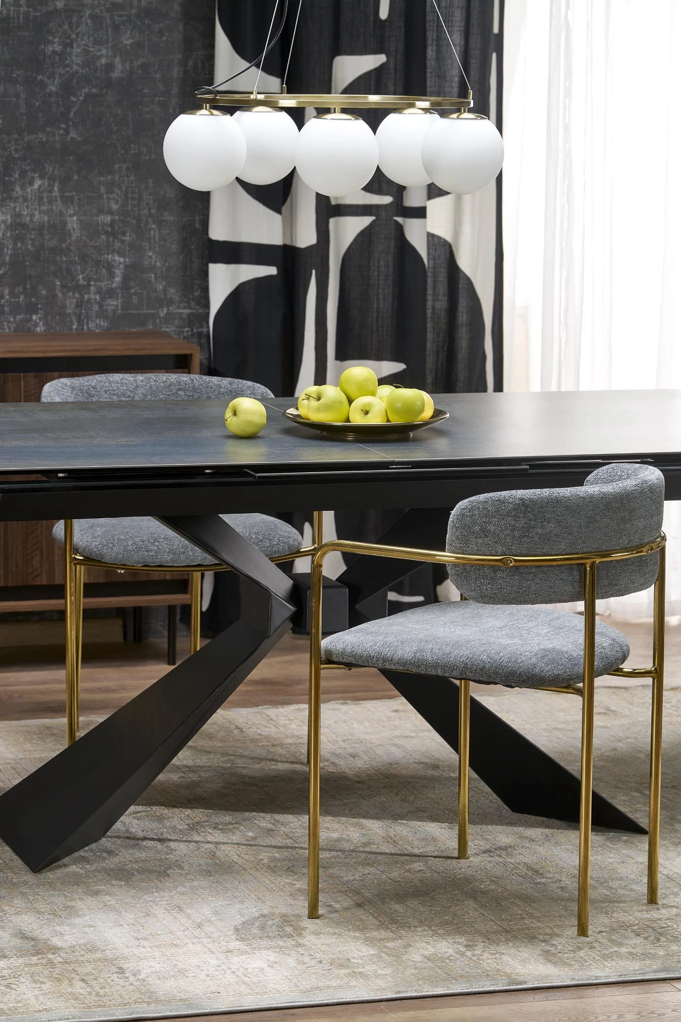 Stół LUCIANO to wyjątkowa propozycja łącząca nowoczesny design z elegancją użytkową. Charakterystyczny, nietuzinkowy blat w kolorze niebieskiego marmuru wykonany ze spieku ceramicznego imitującego naturalny kamień nadaje meblowi luksusowy i designerski charakter. Kontrastuje to z solidną, czarną metalową podstawą, która podkreśla industrialny i jednocześnie elegancki styl.