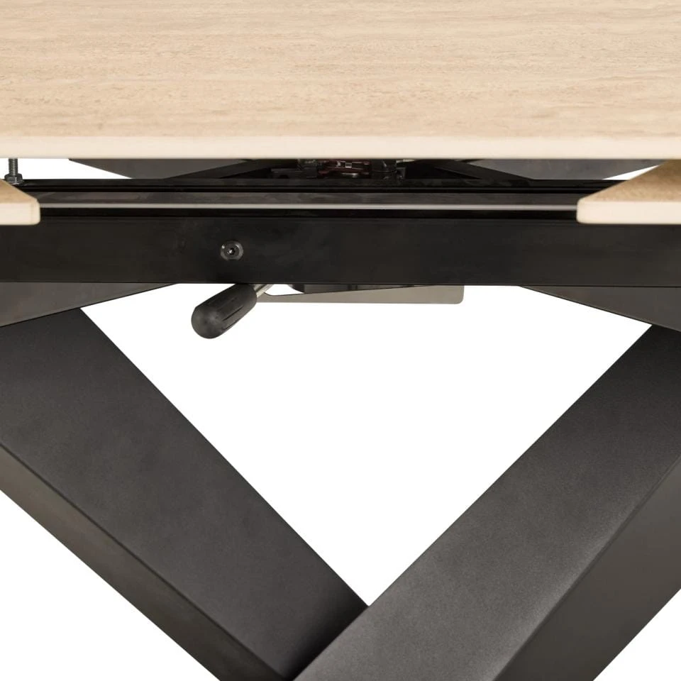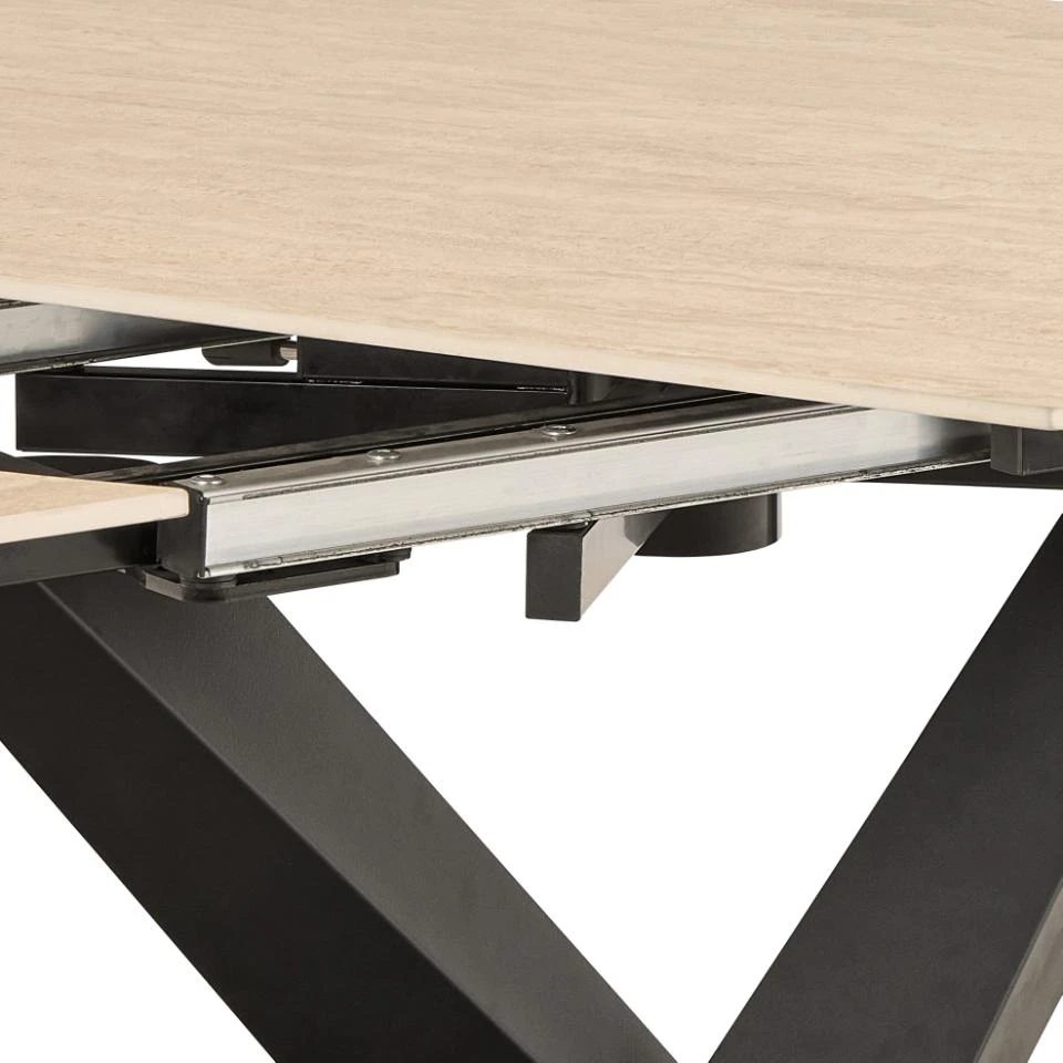 Stół wyróżnia się eleganckim zestawieniem barw – piaskowy blat ceramiczny pięknie kontrastuje z czarną podstawą, tworząc harmonijny i nowoczesny wygląd.
