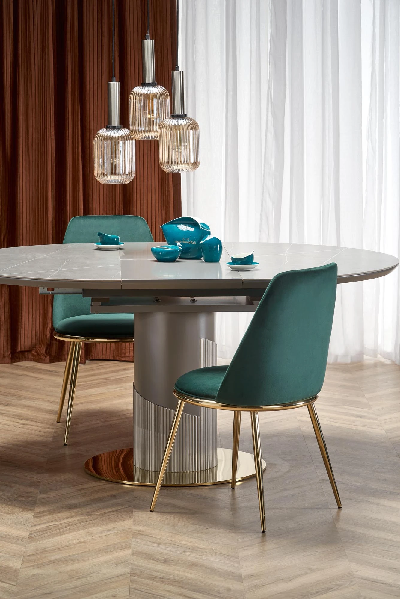 Stylowy stół rozkładany MUSCAT marki Halmar to doskonały wybór dla osób ceniących nowoczesny design, funkcjonalność oraz elegancję inspirowaną naturalnym kamieniem. Okrągły blat w kolorze popielatego marmuru nadaje wnętrzu wyjątkowego charakteru i świetnie komponuje się z aranżacjami nowoczesnymi, loftowymi oraz minimalistycznymi.