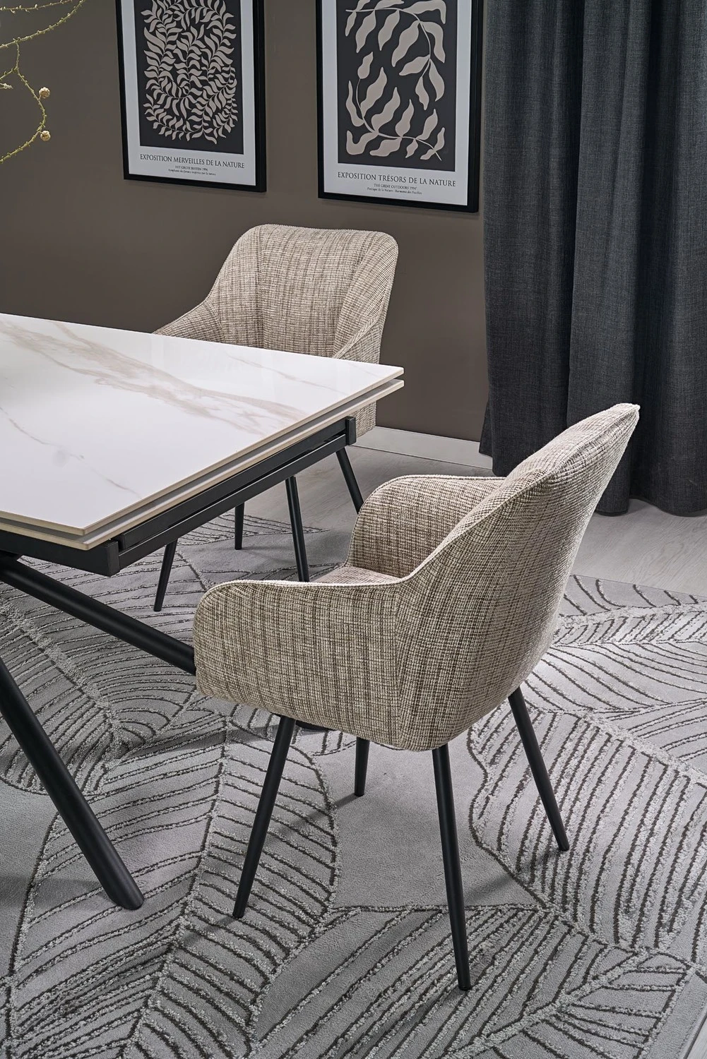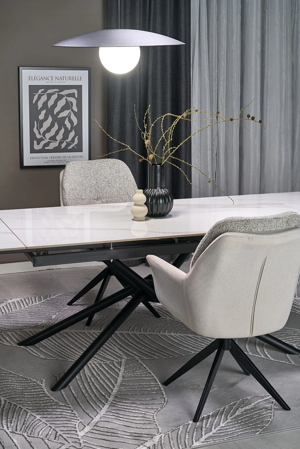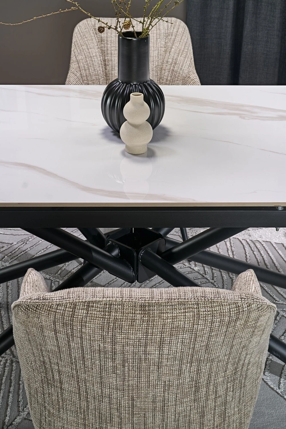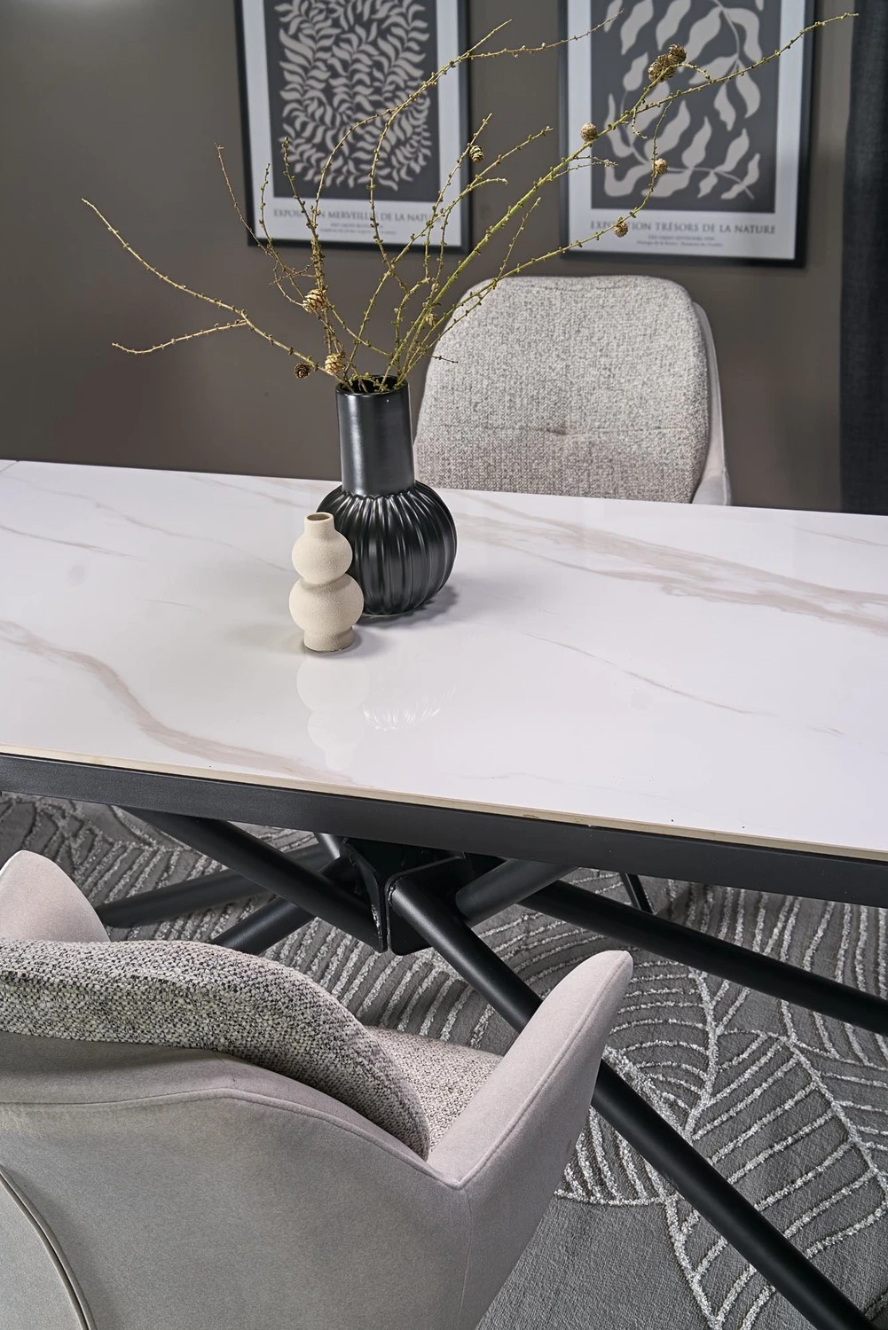 Stół VITORINO w wersji z białym marmurem to elegancka propozycja dla miłośników jasnych, nowoczesnych wnętrz. Blat ze spieku w dekorze białego marmuru wyróżnia się subtelnym użyleniem i efektownym połyskiem, który dodaje przestrzeni lekkości i luksusowego charakteru.