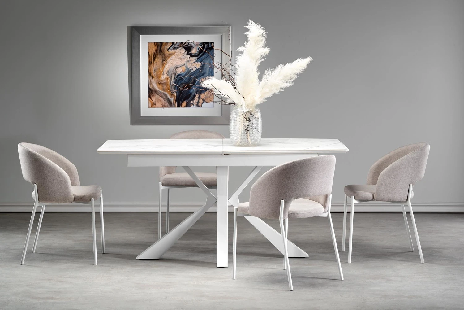 Stół VIVALDI to elegancka propozycja w stylu nowoczesnym i glamour, która przyciąga uwagę jasną, harmonijną kolorystyką. Blat w dekorze białego marmuru prezentuje się niezwykle efektownie, dodając wnętrzu lekkości i luksusowego charakteru.