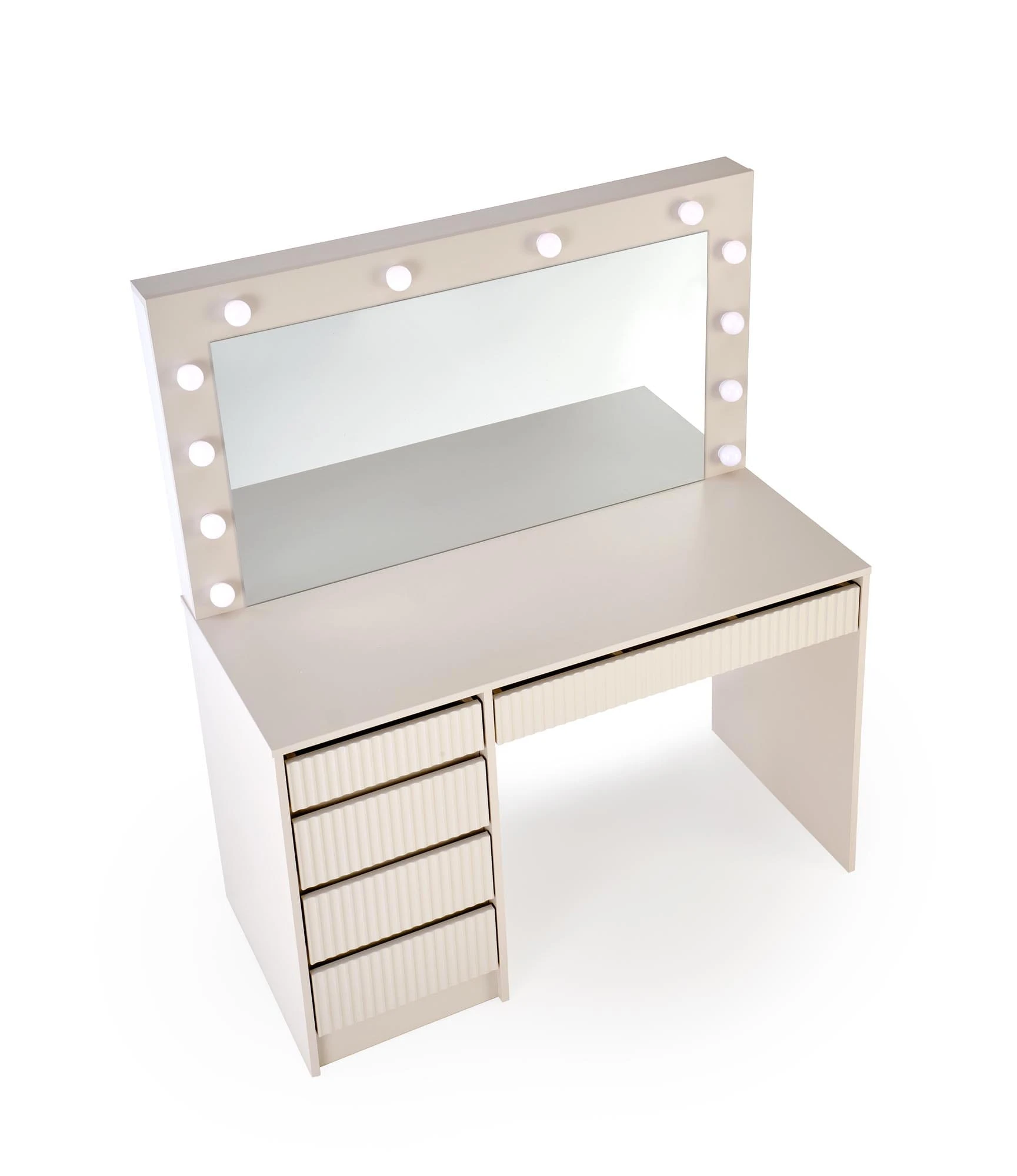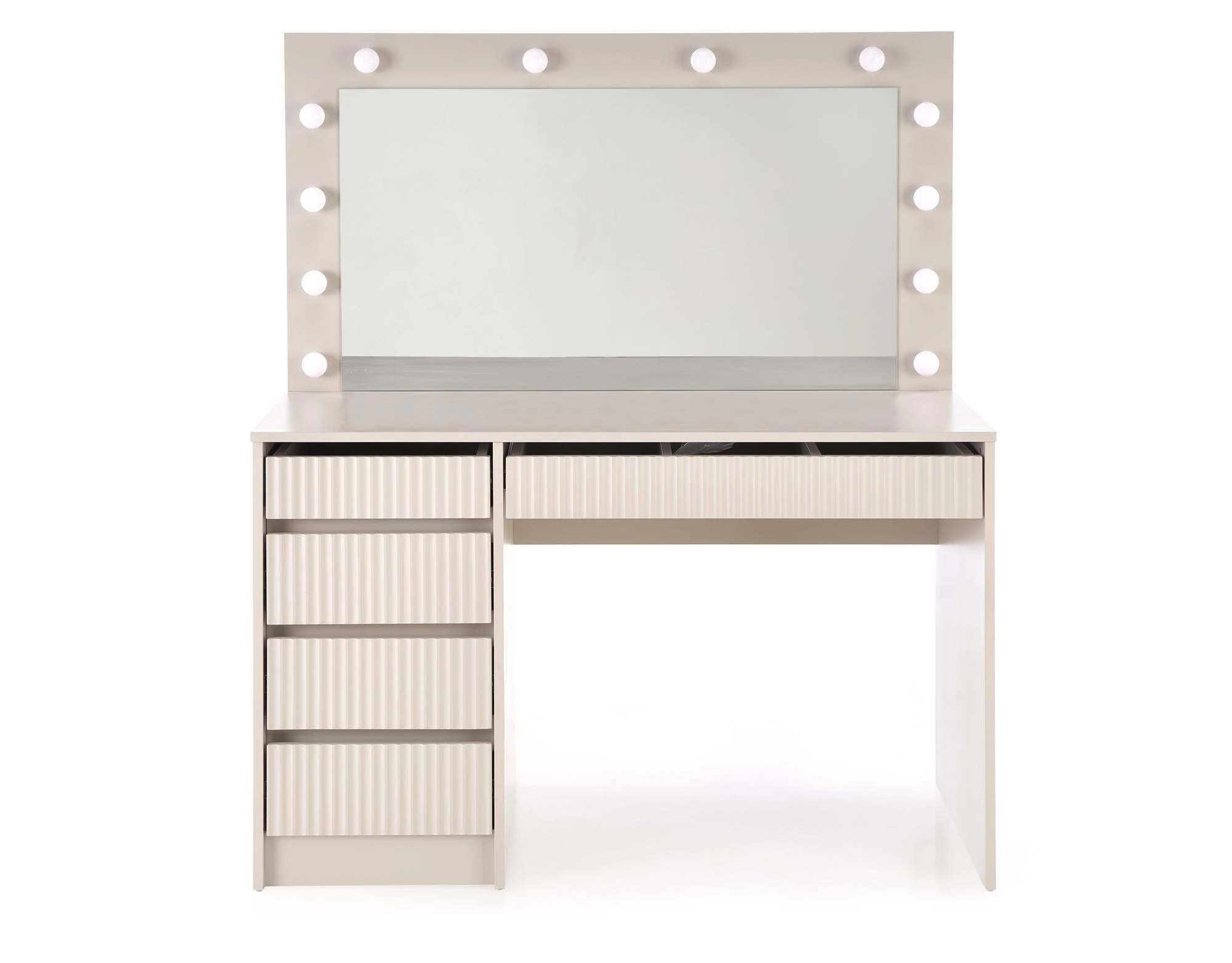 Model XL 2 to powiększona wersja klasycznej toaletki Hollywood – oferuje jeszcze więcej przestrzeni do przechowywania oraz duże lustro z oświetleniem LED, które zapewnia idealne warunki do makijażu i codziennej pielęgnacji. Kolor kaszmir wprowadza ciepły, elegancki klimat i doskonale komponuje się z wnętrzami w stylu nowoczesnym, glamour czy soft loft.