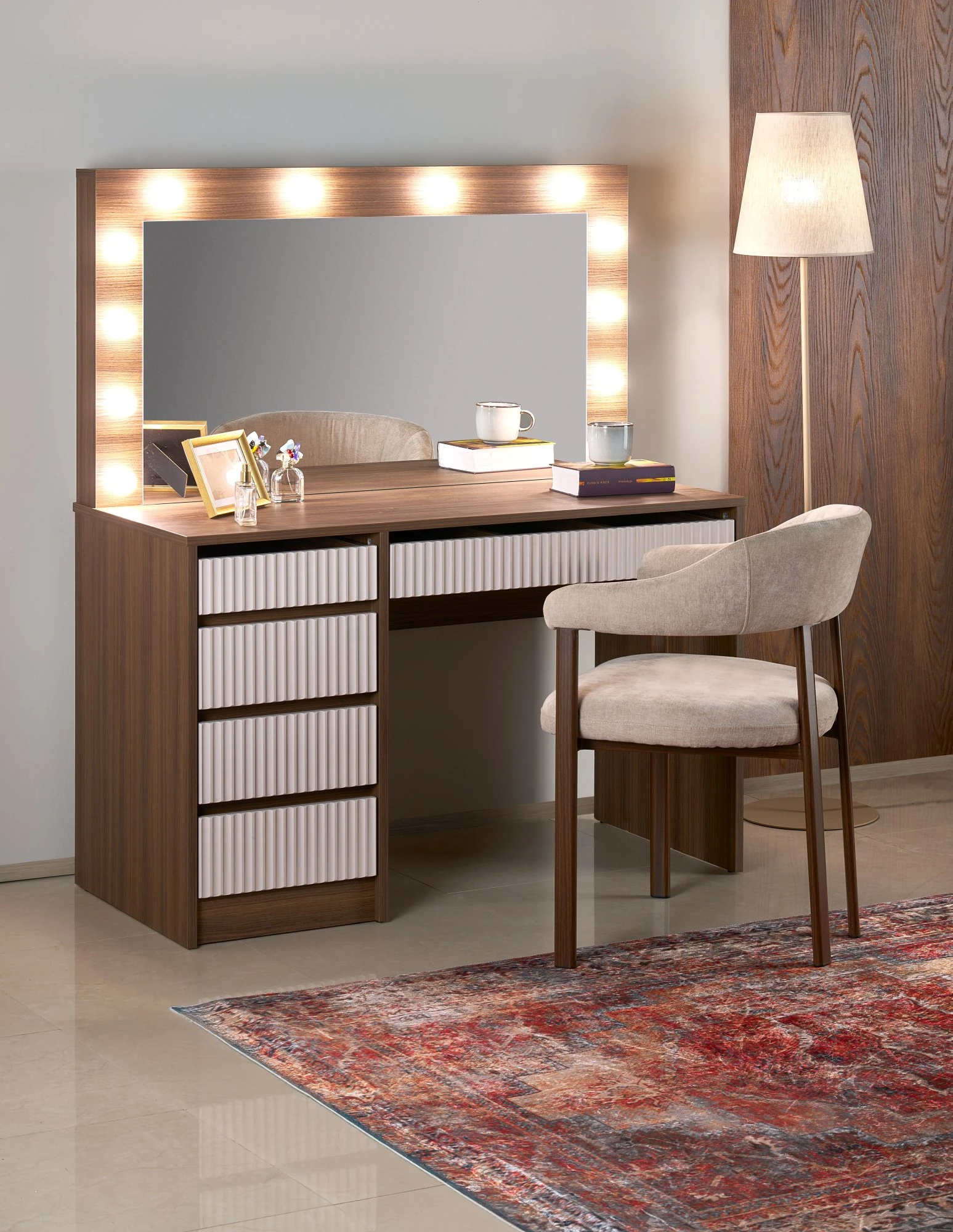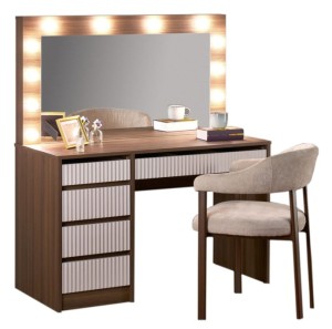 Duże lustro z wbudowanym oświetleniem LED zapewnia doskonałe warunki do wykonywania makijażu i stylizacji – równomierne światło eliminuje cienie i podkreśla każdy detal. Przestronny blat oraz liczne szuflady pozwalają na wygodne przechowywanie kosmetyków, biżuterii i akcesoriów, pomagając utrzymać porządek.
