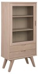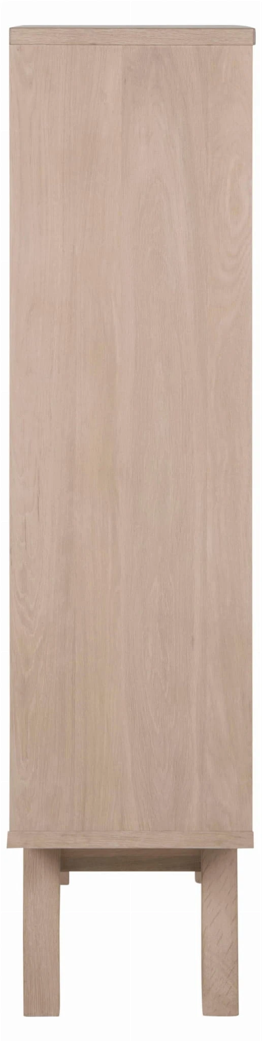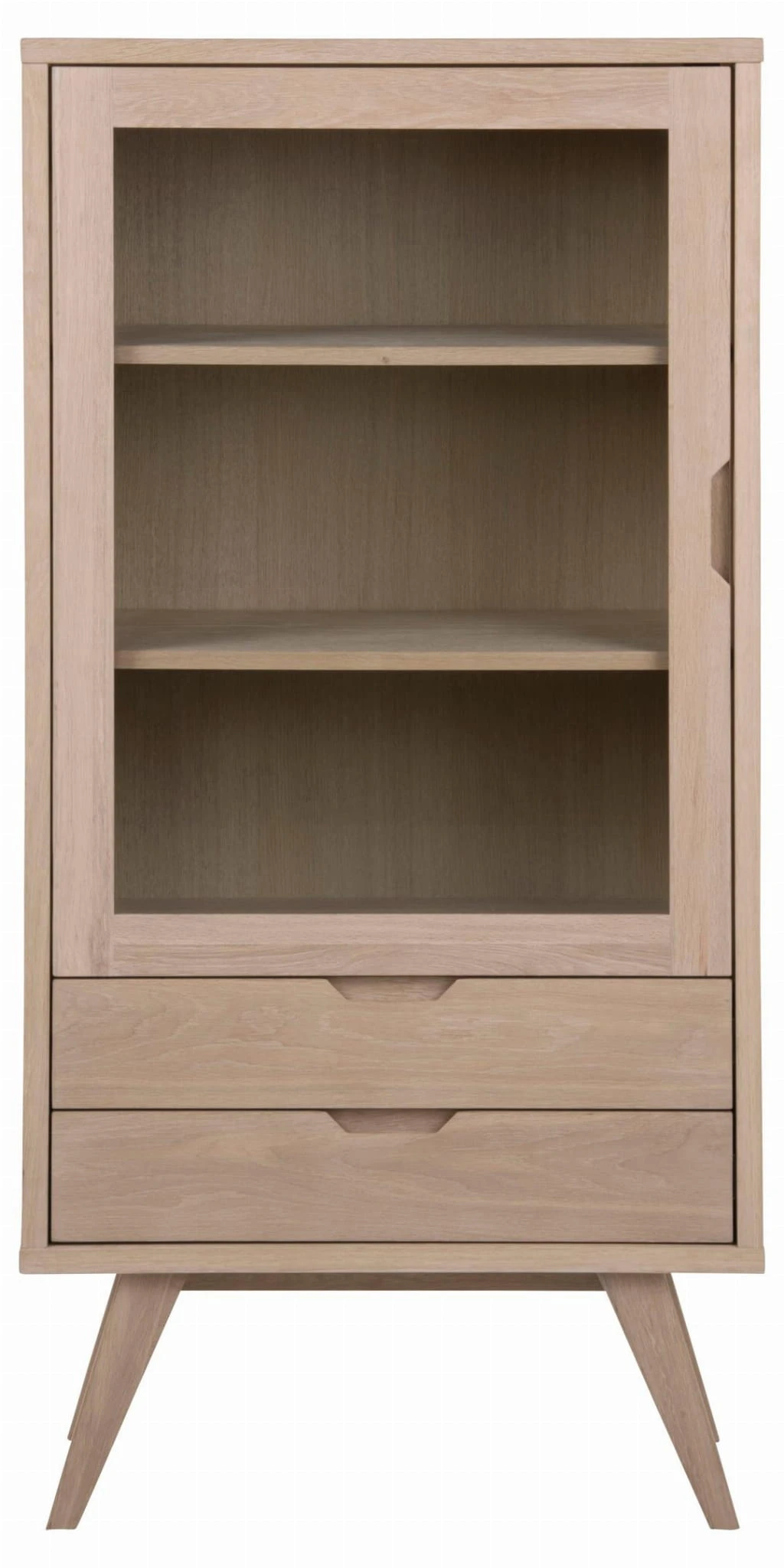 Szafka wystawowa A-Line o wymiarach 72x36x145 cm to połączenie funkcjonalności i skandynawskiego stylu. Szafka w całości wykonany jest z materiałów w kolorze dębu bielonego - nadaje to elaganckiegi i nowocznego wyglądu. Gruba rama i nogi dodają meblowi solidności i stabilności. Szafka wystawowa A-Line wyposażona jest w jedne drzwi z przezroczystego hartowanego szkła oraz dwie półki i dwie szuflady, co zapewnia dużą ilość miejsca do przechowywania. Szuflady wyposażone są w metalowe prowadnice, co gwarantuje płynne i ciche wysuwanie. Dwie regulowane półki umożliwiają dostosowanie przestrzeni do indywidualnych potrzeb.