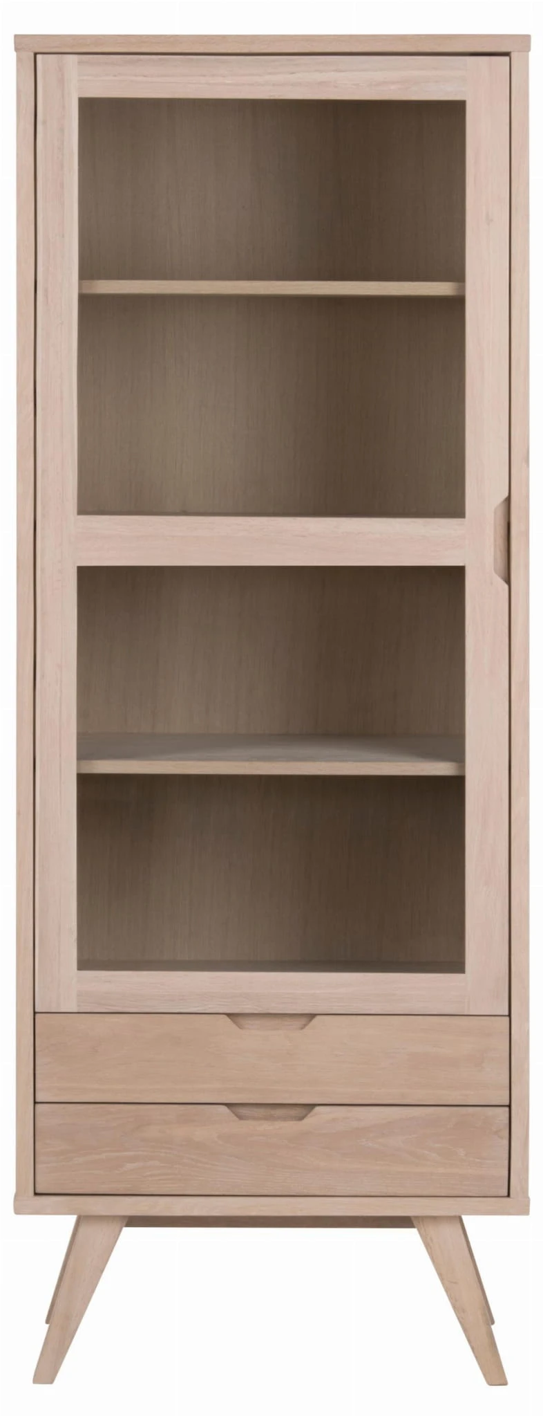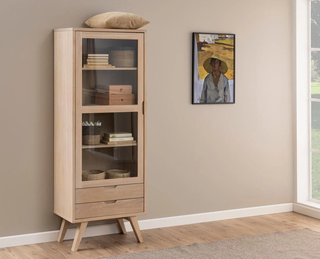 Szafka wystawowa A-Line o wymiarach 72x42x190 cm to połączenie funkcjonalności i skandynawskiego stylu. Szafka w całości wykonany jest z materiałów w kolorze dębu bielonego - nadaje to elaganckiegi i nowocznego wyglądu. Ta szafka to nowoczesna interpretacja klasycznego skandynawskiego designu. Smukły profil zapewnia lekkie i nowoczesne wyrażenie mebla. Szafka oferuje mnóstwo miejsca do przechowywania za szklanymi drzwiami, a na niewidoczne przechowywanie można wykorzystać 2 szuflady. Zwróć uwagę na zintegrowane uchwyty.